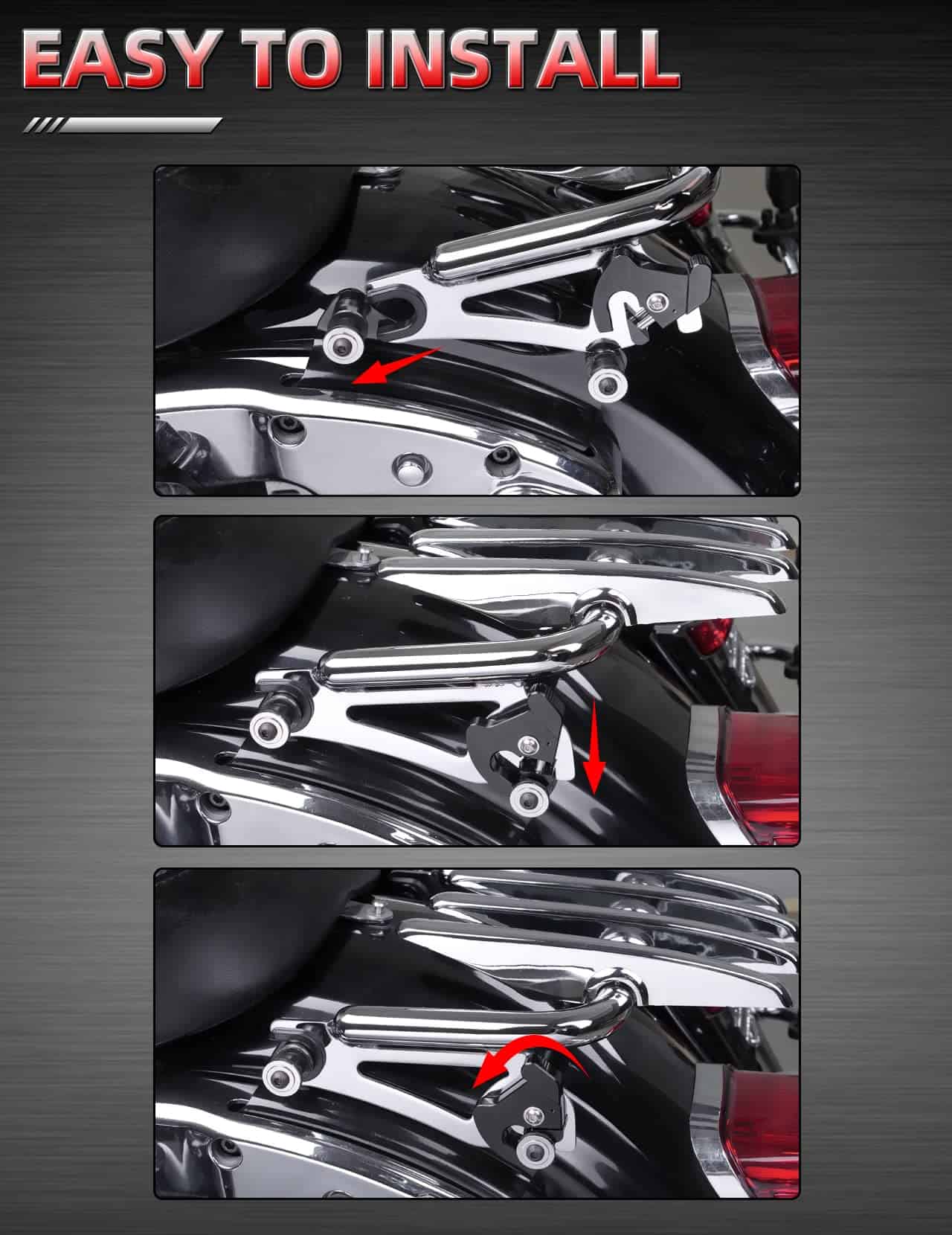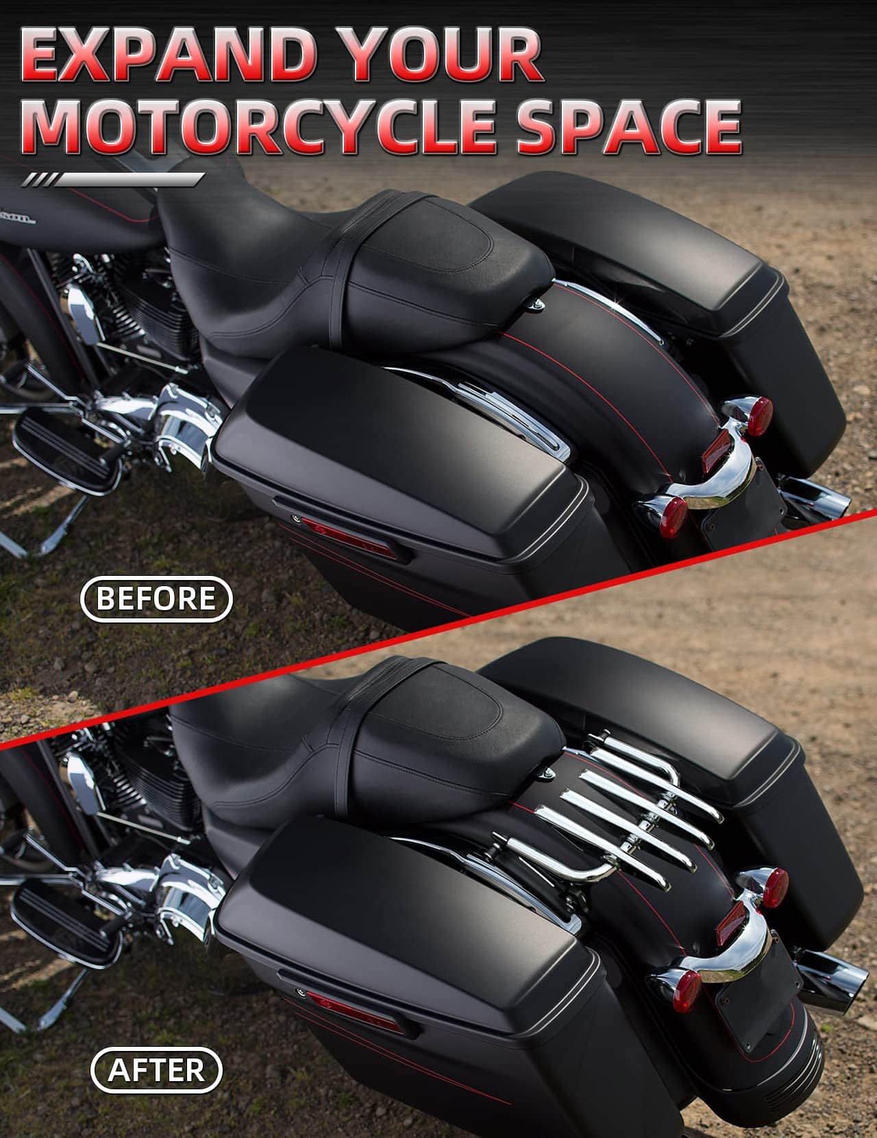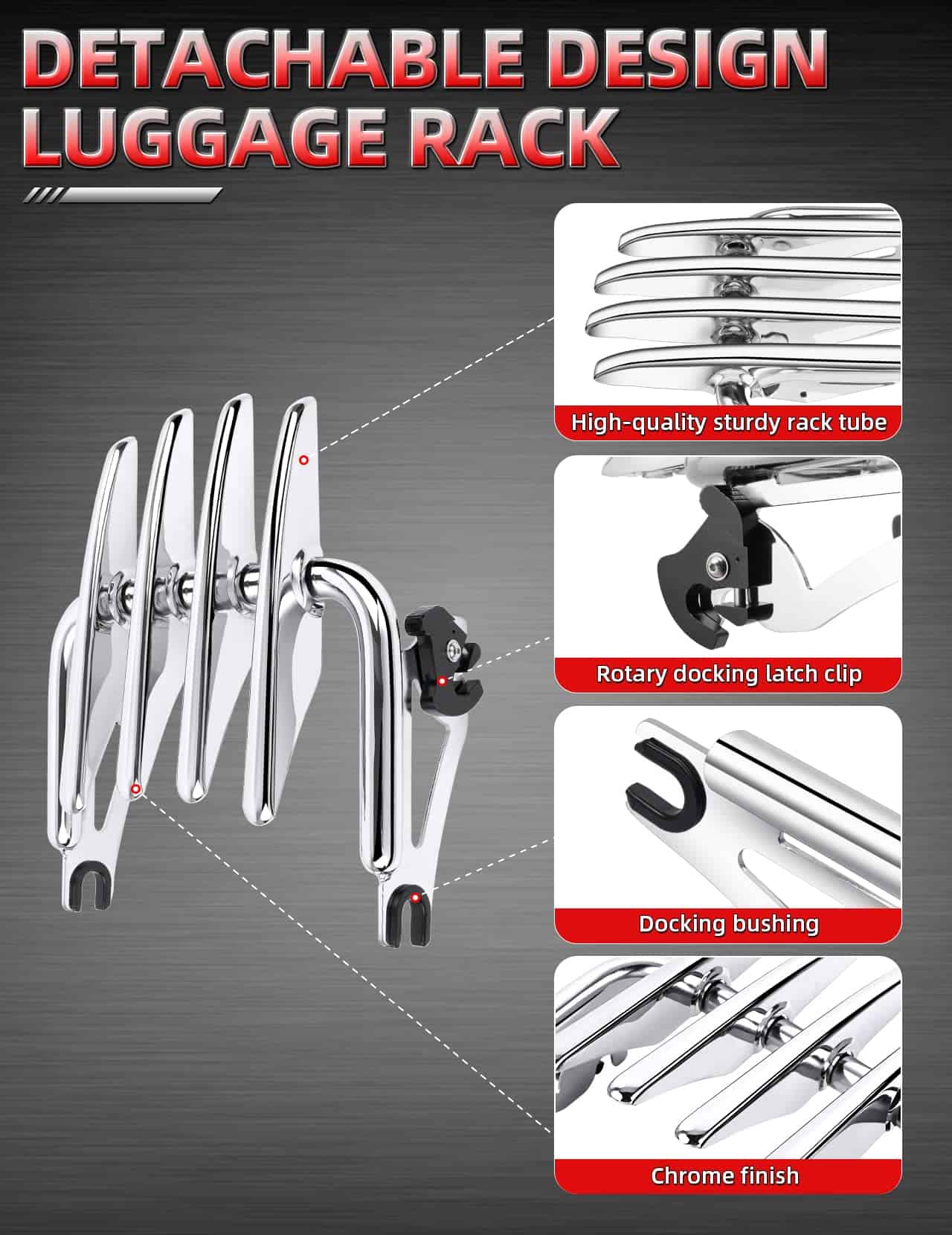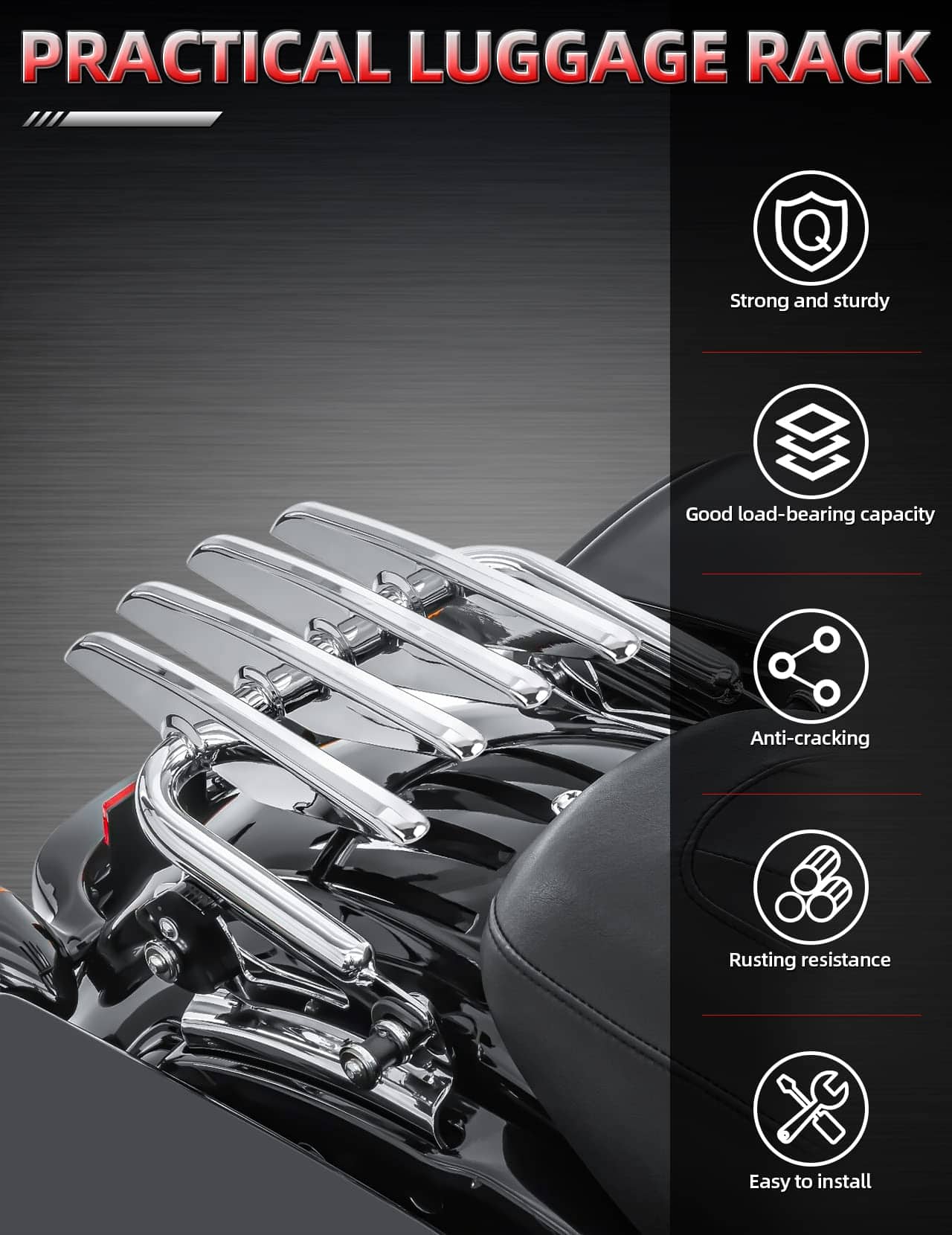 Parrilla de equipaje desmontable de alta calidad compatible con Harley Davidson Touring Street Glide, Electra Glide, Road Glide, Road King 2009-2024. Esta parrilla de equipaje cromada aftermarket está diseñada con un soporte más resistente, hecho de metal de alta calidad que la hace resistente al óxido y difícil de romper. Proporciona una capacidad de carga adicional de hasta 10 libras con extensiones, lo que permite llevar más equipaje durante tus viajes en motocicleta. La instalación es rápida y sencilla, pudiendo colocarse o quitarse de la motocicleta en cuestión de segundos. Nota: Se necesita comprar por separado el hardware de montaje de 4 puntos para la instalación. Incluye 1 parrilla de equipaje desmontable, las instrucciones no están incluidas.