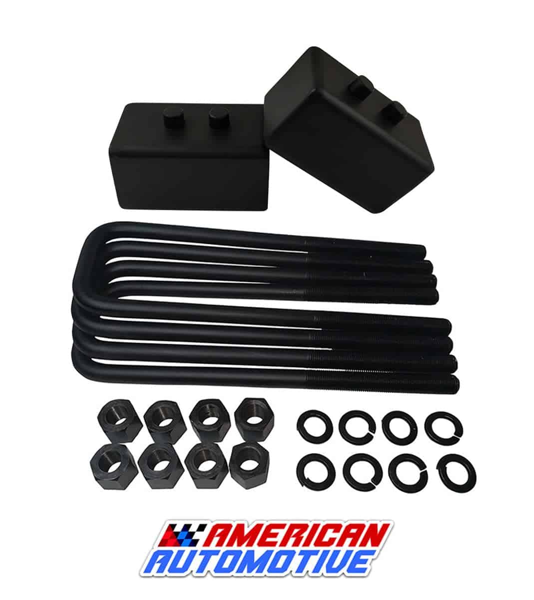 Nuestros bloques de elevación de acero son más fuertes que los de aluminio, con una construcción más estable con pasadores prensados. Están diseñados para aumentar la capacidad de carga y remolque trasero. Los pernos en U American Automotive están fabricados para lograr la máxima fuerza de sujeción y están garantizados de por vida. Hechos de acero al carbono certificado 1541 de dibujo en frío, material de fábrica OEM con hardware de grado 8, los pernos en U americanos encarnan una resistencia extrema y mantienen las características de manejo OEM. Especificaciones del bloque de elevación: 5″ de largo x 3″ de ancho, 3″ de alto. Especificaciones de los pernos en U: Redondos, longitud de 11 1/4″ x ancho de 3 1/4″ x paso de rosca de 9/16″.