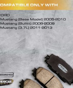 Pastillas de Freno de Cerámica DELANTERAS American Black D-1464 PREMIUM para FORD Mustang. Estas pastillas de freno están diseñadas para mejorar la potencia de frenado, ofreciendo una experiencia silenciosa y segura en una variedad de condiciones de carretera. La tecnología de molde positivo aplicada con presión extrema comprime el material de fricción y lo une a la placa de respaldo para una mayor eficiencia. El ajuste perfecto, la ausencia de ruido, vibración y polvo, así como las ranuras y chaflanes premium, garantizan un frenado suave y consistente. Verifique su modelo en las imágenes para asegurar la compatibilidad. ¡Obtenga un rendimiento óptimo con estas pastillas de freno de cerámica de alta calidad!