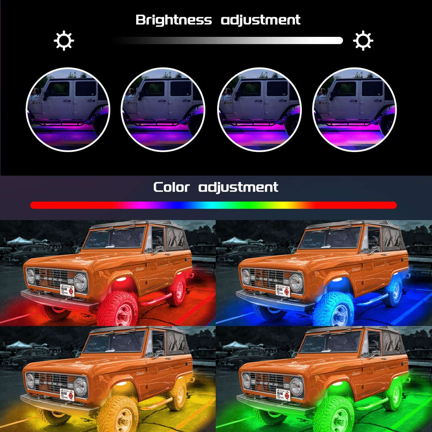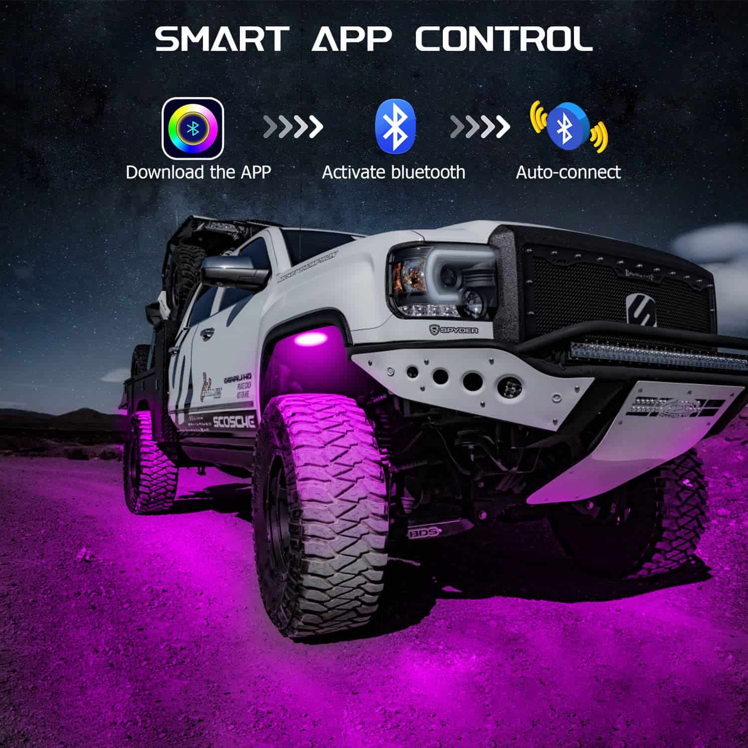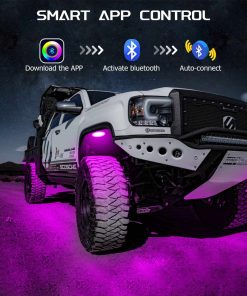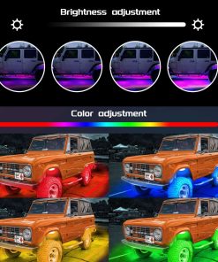 1. Control de APP y Control Remoto de 28 Teclas: El color y el modo de trabajo de las luces de roca AMKI pueden cambiar mediante control de APP o control remoto. También puedes controlar totalmente 16 millones de colores RGB para personalizar diferentes escenarios de iluminación (color, brillo, frecuencia de parpadeo) que desees, para satisfacer tus preferencias de iluminación y mejorar la visibilidad nocturna bajo y alrededor de tu vehículo.