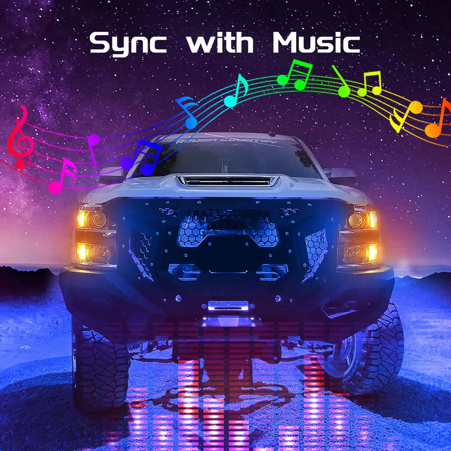 4. Modo de Música y Advertencia de Luz de Freno: Las luces exteriores de LED para automóviles AMKI se sincronizarán con tu música y cambiarán de color, para que te diviertas más en la carretera. Además, estas luces de roca tienen la función de advertencia de luz de freno, la luz roja se encenderá al frenar, para mantener la distancia con otro automóvil, asegurando tu seguridad.