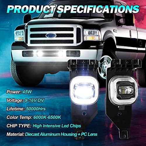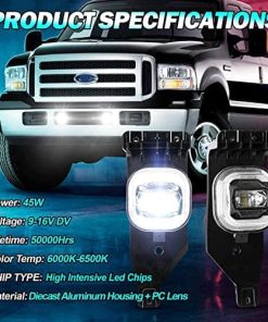 1. Amplia Aplicación – Estas luces antiniebla LED para Ford son perfectas para los modelos Super Duty F250/F350/F450 2005 2006 2007. 2. Súper Brillantes – Las luces antiniebla LED de Ford mejoradas combinan perfectamente los tres modos de luz antiniebla, DRL y luces intermitentes amarillas, proporcionando una luz blanca de 6500K, la cual es más amplia y lejana que otras luces halógenas comunes en el mercado, sin causar ceguera, mejorando así la comodidad y seguridad al conducir. 3. Alto Rendimiento – Lente duradera de PC y carcasa de aluminio fundido para resistir cualquier clima adverso. Sistema de disipación de calor rápido. Resistente al agua IP67, a prueba de óxido y a prueba de golpes. Vida útil de hasta 50,000 horas. APROBADO POR DOT, legal en la carretera. 4. FÁCIL DE INSTALAR – Plug and play, sin necesidad de cambiar ningún tornillo, por lo general toma 15 minutos instalarlas. EMC incorporado, sin problemas de parpadeo. 5. COMPRA CON CONFIANZA – El paquete incluye 1 par de luces antiniebla LED para Ford. Ofrecemos 1 AÑO DE GARANTÍA. Si no está satisfecho con estas luces antiniebla LED, no dude en contactarnos a través de mensaje de el fabricante, siempre estaremos aquí para satisfacerlo.