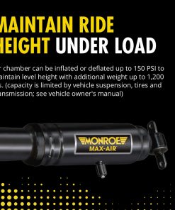 Ideal para remolcar, los amortiguadores Monroe Max-Air se pueden inflar o desinflar hasta 150 PSI para mantener la altura nivelada con un peso adicional de hasta 1,200 lbs. (la capacidad está limitada por la suspensión del vehículo, los neumáticos y la transmisión. Consulte el manual del propietario del vehículo.)