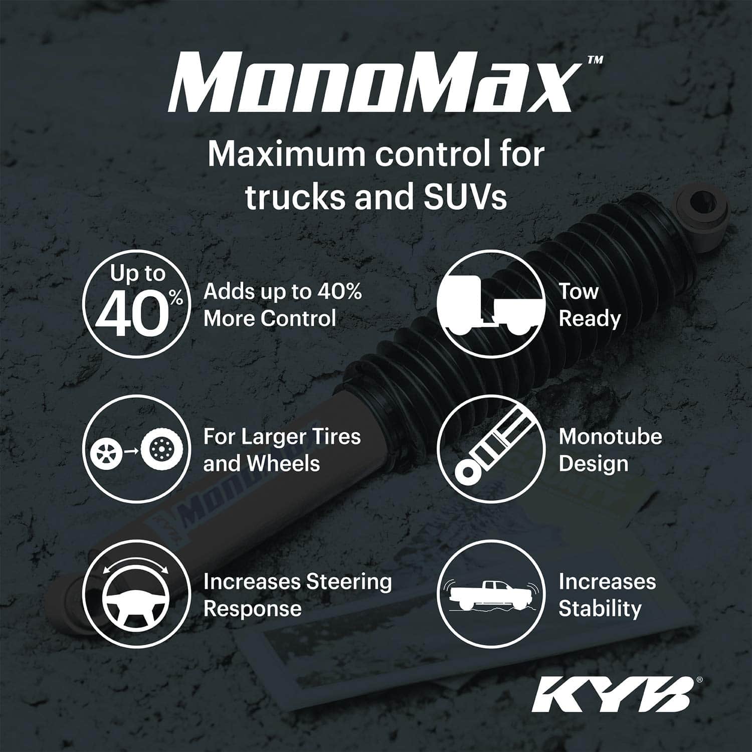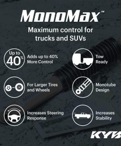 Las condiciones difíciles exigen amortiguadores de camión resistentes. El KYB MonoMax de gran diámetro proporciona la estabilidad adicional que requieren vehículos más pesados, más potentes o con un centro de gravedad alto. El KYB MonoMax es un amortiguador monotubo de servicio pesado que ofrece el máximo control, manejo y durabilidad de todos los amortiguadores KYB; y está diseñado exclusivamente para camiones. El resistente diseño del MonoMax se ajusta automáticamente a las condiciones de conducción con un rendimiento sin desvanecimiento. El KYB MonoMax tiene una excelente reputación en vehículos que realizan trabajos reales, van fuera de carretera, remolcan un tráiler o transportan cargas pesadas. Utiliza un anillo de pistón de acero recubierto de zinc listo para el trabajo e incluye una bota contra el polvo todo terreno.