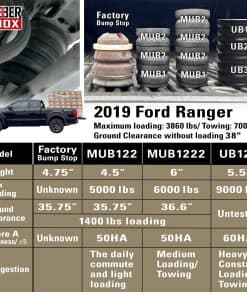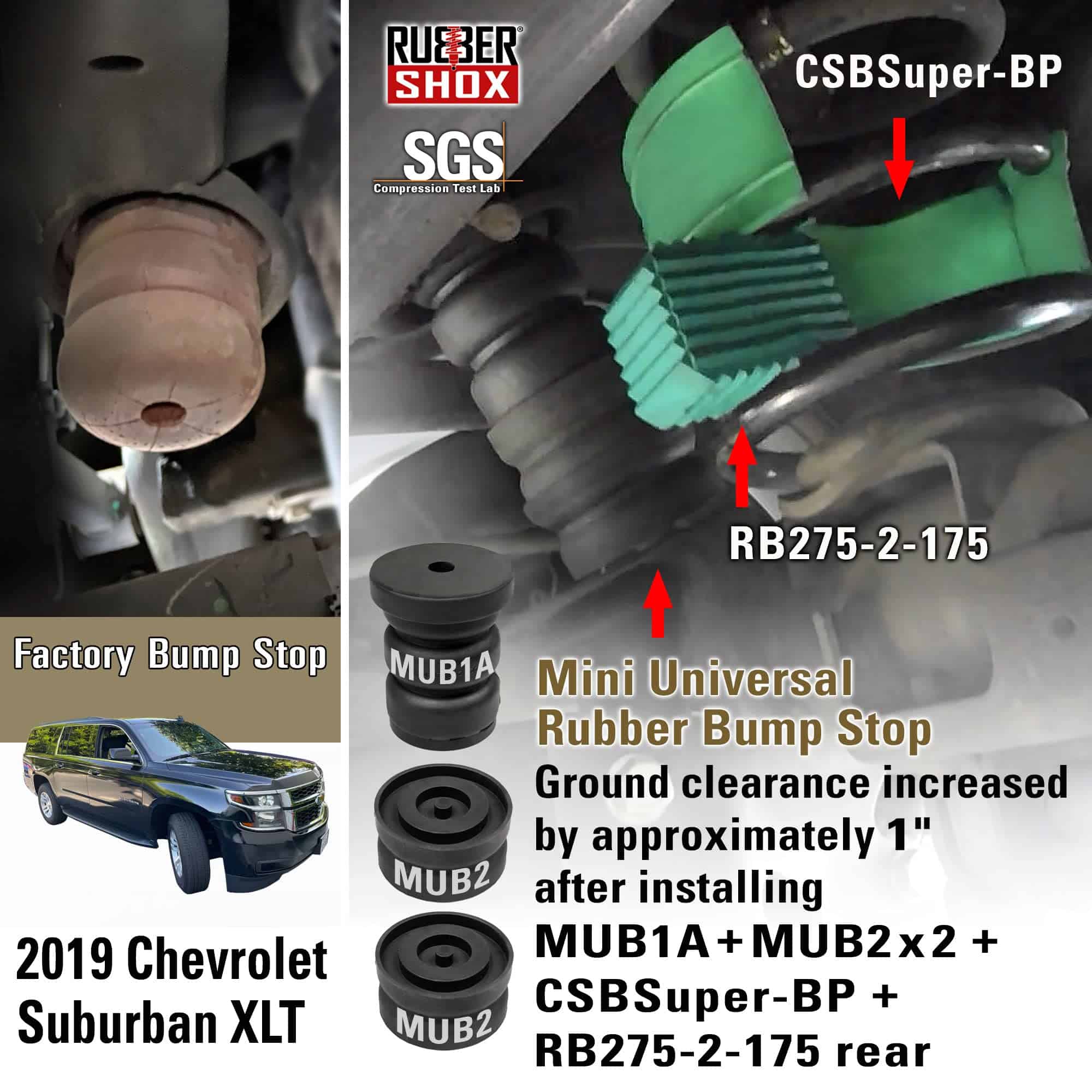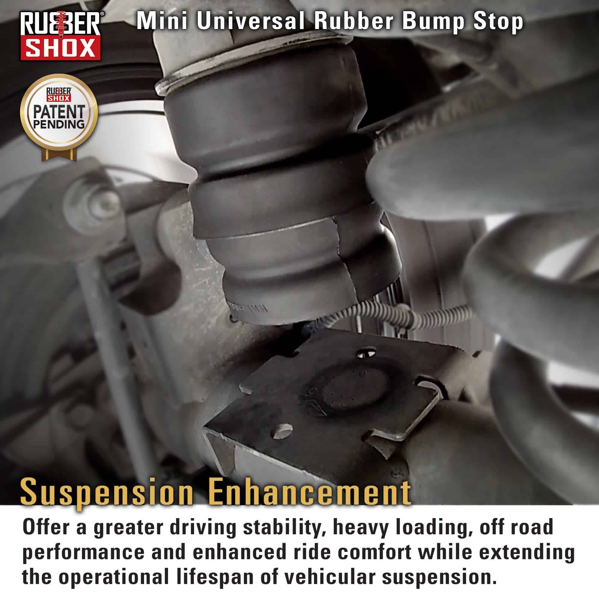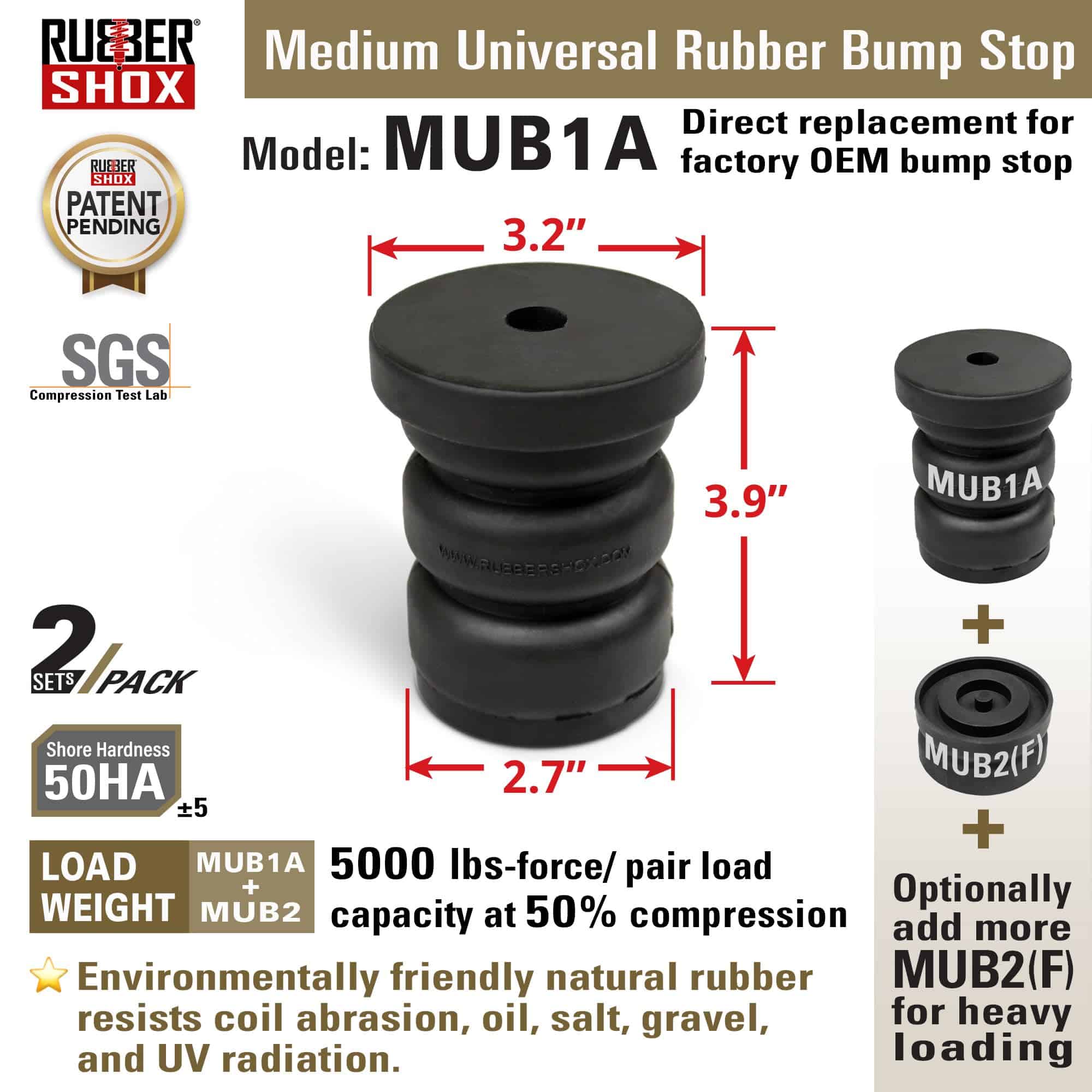 Diseñado para camionetas ligeras y SUVs como Toyota Tacoma, Ford Ranger, GMC Canyon, Chevrolet Colorado, y más, el amortiguador de goma universal modular RubberShox presenta una capacidad de carga de 5000 lbs y una dureza de 50HA para una durabilidad excepcional. Con un diseño de amortiguadores de goma modulares interconectados, este sistema te permite ajustar la altura de la suspensión para una configuración personalizada. Elaborado con goma natural de primera calidad, estos topes de goma son resistentes a la ruptura, abrasión, aceite, sal, grava, radiación UV y altas temperaturas. Mejora la suspensión de tu vehículo con estos topes de goma RubberShox y disfruta de una conducción más segura y estable. Incluye 2 piezas del módulo superior MUB1A para un fácil reemplazo de los topes de goma OEM.