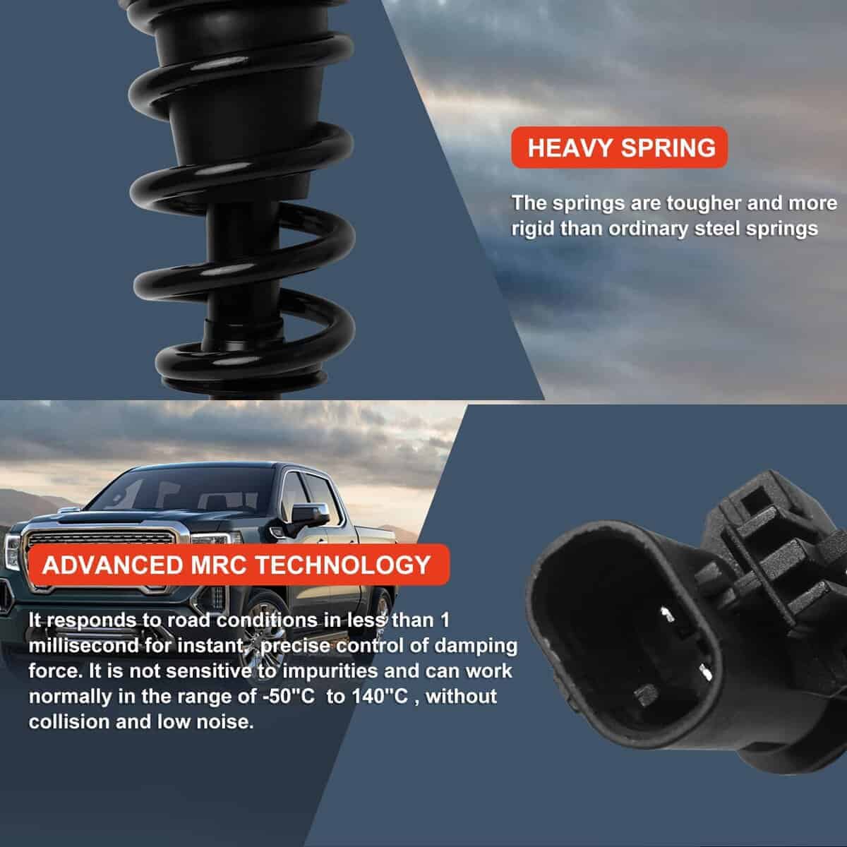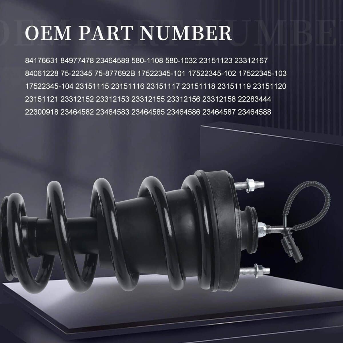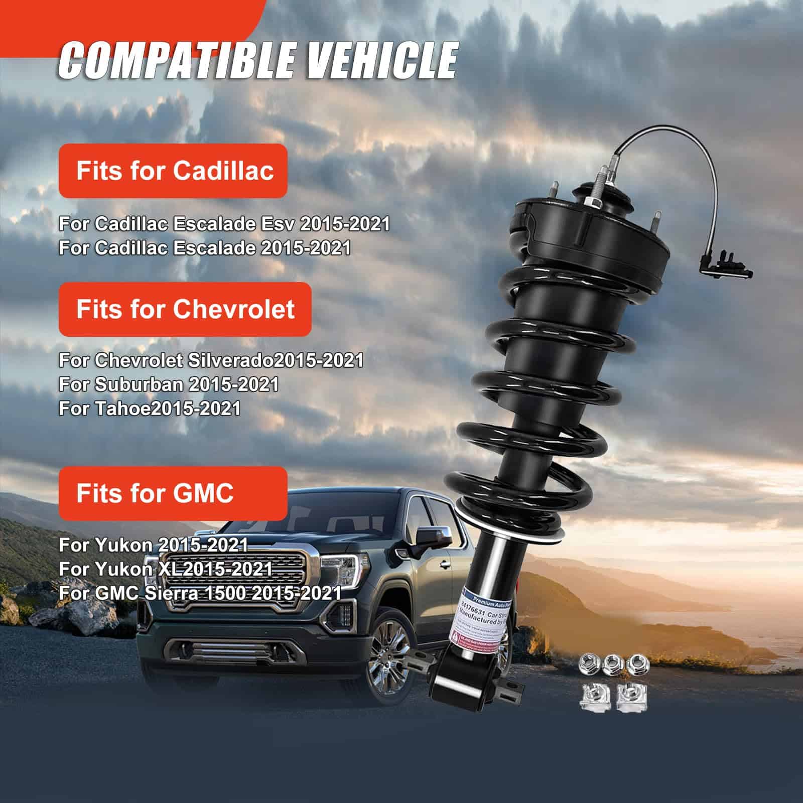 Amortiguador de suspensión delantero eléctrico automático para 2015-2021 Cadillac Escalade, Chevy Tahoe, Suburban Silverado, GMC Sierra 1500 y Yukon XL. Este amortiguador de control magnético es compatible con una amplia gama de modelos de vehículos para proporcionar un rendimiento óptimo en la carretera. Con una construcción de alta calidad y soldadura de tubo exterior de metal resistente, este amortiguador mejora el rendimiento de frenado, acorta la distancia de frenado, proporciona una fuerza de amortiguación más alta y reduce la fricción. Diseñado para adaptarse precisamente a los vehículos mencionados, estos amortiguadores han sido probados en la fábrica para garantizar un ajuste perfecto. Reemplace los amortiguadores originales de GM con estos amortiguadores delanteros de alta calidad para disfrutar de un viaje más suave y confortable. Mejore la calidad de conducción de su automóvil con estos amortiguadores excepcionales que hacen que la conducción sea más agradable y menos estresante.