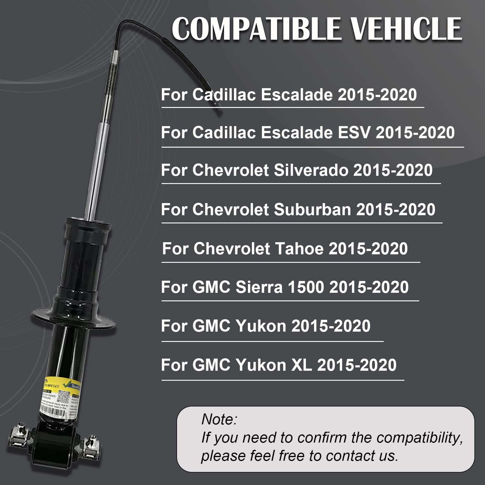2. Vehículo compatible El amortiguador delantero Kalmaegee es compatible con Cadillac Escalade 2015-2020, para Cadillac Escalade ESV 2015-2020, para Chevrolet Silverado 2015-2020, para Chevrolet Suburban 2015-2020, para Chevrolet Tahoe 2015-2020, para GMC Sierra 1500 2015-2020, para GMC Yukon 2015-2020, para GMC Yukon XL 2015-2020.