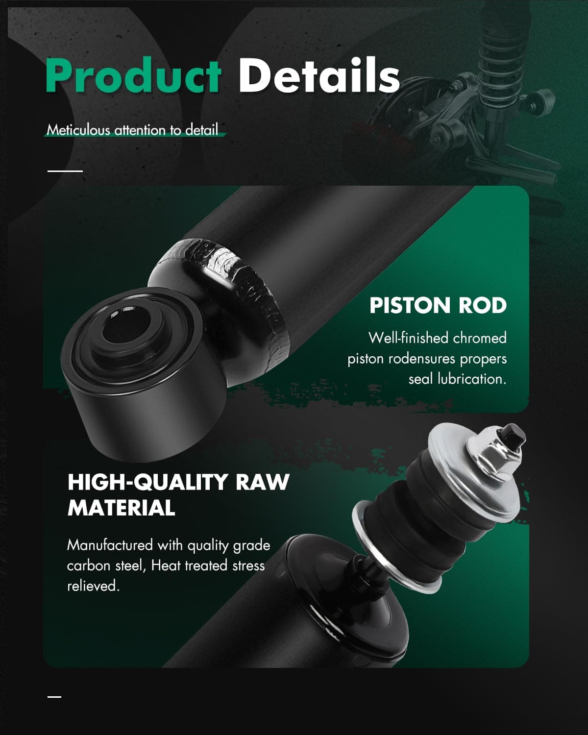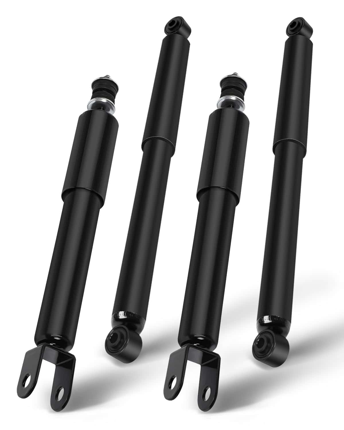 Conjunto delantero y trasero de amortiguadores para conductor y pasajero: 344381 / 37151 / 344386 / 37152, compatibles con Chevy Silverado 1500 1999-2006 y GMC Sierra 1500 1999-2008. Los amortiguadores SCITOO de alto rendimiento tienen un pistón cromado duro, procesos de superficie cromada con microgrietas y pulido vertical de ultra precisión. Reduzca el rebote, la inclinación y el balanceo del vehículo, la zambullida de frenado y el hundimiento de la aceleración. La instalación es fácil y rápida, el diseño de tubo único disipa el calor rápidamente, mejora el control y la estabilidad, y proporciona una conducción más silenciosa y suave que los amortiguadores desgastados o dañados.