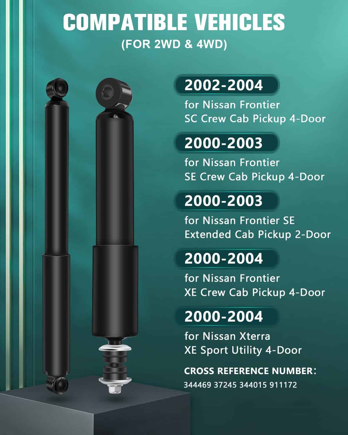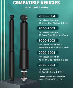 Condición del artículo: 100% nuevo en condición original de fábrica. Nunca ha sido usado ni instalado. Calidad OE certificada TS17329. Mejora la capacidad de manejo y rendimiento general de su vehículo. La unidad completamente ensamblada garantiza una instalación fácil y rápida para los bricoladores, lo que le ahorra tiempo y costos laborales. Adecuado para vehículos: 2002-2004 para Nissan Frontier SC Crew Cab Pickup de 4 puertas, 2002-2004 para Nissan Frontier SC Extended Cab Pickup de 2 puertas, 2000-2003 para Nissan Frontier SE Crew Cab Pickup de 4 puertas, 2000-2003 para Nissan Frontier SE Extended Cab Pickup de 2 puertas, 2002-2004 para Nissan Frontier SVE Crew Cab Pickup de 4 puertas, 2002-2004 para Nissan Frontier SVE Extended Cab Pickup de 2 puertas, 2000-2004 para Nissan Frontier XE Crew Cab Pickup de 4 puertas, 2000-2004 para Nissan Frontier XE Extended Cab Pickup de 2 puertas, 2000-2001 para Nissan Frontier XE Standard Cab Pickup de 2 puertas, 2000-2004 para Nissan Xterra SE Sport Utility de 4 puertas, 2000-2004 para Nissan Xterra XE Sport Utility de 4 puertas. Especificaciones: Tipo: Amortiguador. Piezas incluidas: 4Pcs Amortiguador Delantero Trasero. Referencia cruzada OEM: 344469 37245 344015 911172. Tipo de ajuste: reemplazo directo / cargado a gas. Es hora de reemplazar sus amortiguadores si se ve afectado por lo siguiente: 1) El automóvil emite un sonido anormal. 2) El automóvil se hunde cuando el camino es malo o la carga es pesada. 3) Fugas de aceite. 4) El desgaste del neumático es frecuente e irregular. 5) Es difícil controlar el automóvil. 6) La mala estabilidad te hace sentir muy incómodo.