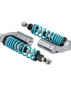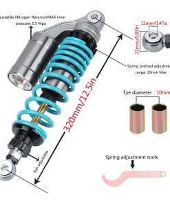 Amortiguadores de aire universales de 320mm para motocicletas Suspensión trasera compatible con Gokart Honda ATV CB Yamaha 12.5 pulgadas 2PCS en azul. La suspensión proporciona una conducción más suave y una mejor gestión general del amortiguador, mejorando la comodidad al conducir, la maniobrabilidad de la motocicleta y la seguridad al conducir. Amortiguador de aire de uso general, adecuado para la mayoría de motocicletas de 150cc a 750cc, Karting (karting), scooters y Moped Quad (ATV) con una longitud de 320mm. Una excelente opción para mejorar sus motocicletas y vehículos todoterreno. El material del producto incluye aleación de aluminio CNC + acero de alta resistencia, resorte de alto rendimiento y con depósito de nitrógeno. Acero anticorrosión, resistente al agua, antihumedad, con apariencia personalizada. Parámetros del producto: Longitud total: 350 mm (13 3/4 pulgadas), diámetro del ojo (con manguito): 12 mm, resistencia a la tracción máxima del ojo: 2.000 kgf, rigidez del resorte: 243 libras (110 kg), carga máxima: 440 libras (200 kg). Amortiguador de motocicleta de ajuste universal para la mayoría de los vehículos. Paquete incluido Un par de amortiguadores, 1 llave, 4 casquillos. (Tenga en cuenta, si su vehículo es demasiado pesado, especialmente para ATV, por favor verifique amablemente la carga máxima de los amortiguadores antes de realizar un pedido.)