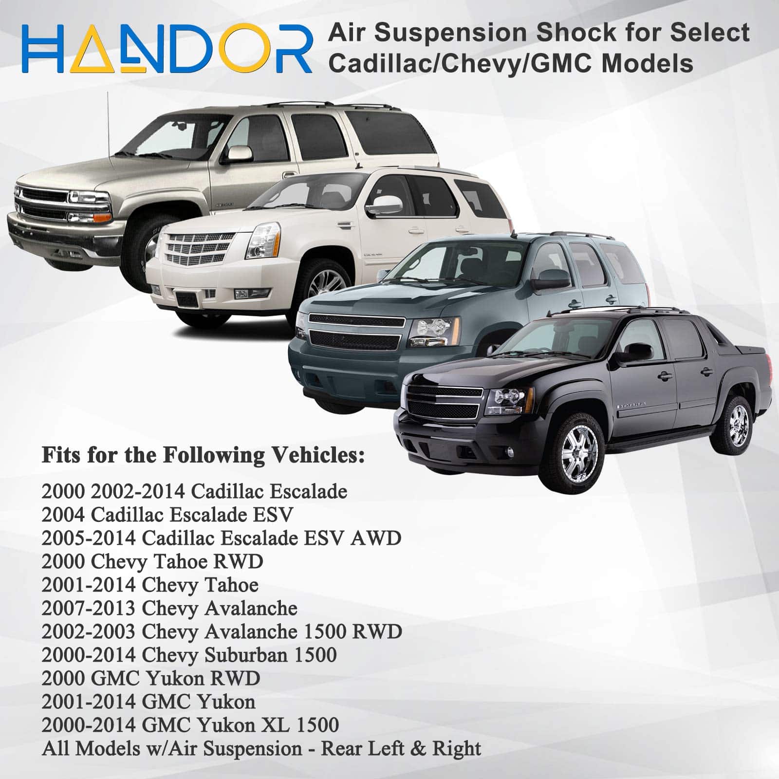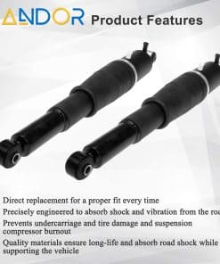Los amortiguadores de aire utilizan aire y presión para suspender el vehículo y absorber los golpes de la carretera. Debido a que son afectados severamente por el peso de las carreteras y los vehículos, las juntas en el impacto de aire eventualmente se deteriorarán y comenzarán a gotear, reduciendo así su rendimiento. Proporcione una calidad de conducción suave y continua con nuestros amortiguadores de suspensión de aire de reemplazo directo. Este producto es adecuado para modelos como Escalade 2000-2014, Escalade ESV 2004-2014, Chevy Suburban 1500 2000-2014, Chevy Avalanche 2007-2013, Chevy Avalanche 1500 2002-2003, Chevy Tahoe 2000-2014, Yukon 2000-2014, Yukon XL 1500 2000-2014. Referencia cruzada para: 949-052, 15756926, 15796834, 15852159, 15852160, 15869656, 15869657, 15869658, 15918525, 15918526, 15924687, 15924688, 15945872, 19300040, 19300045, 19300046, 19300069, 19300071, 19300072, 19303893, 19331451, 19368463, 20836653, 22187152, 22187154, 22187156, 22187158, 22187160, 22400249, 22400885, 23487279, 23487283, 23487284, 25885466, 25885467, 25885469, 25885470, 25979390, 25979391, 25979393, 25979394, 88965338, 88965458, 580-457, 580-458, AS-2700, AS-2715, 4J-0005S.