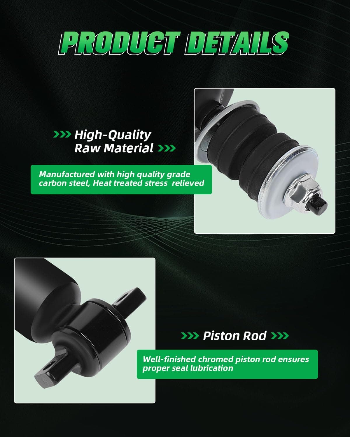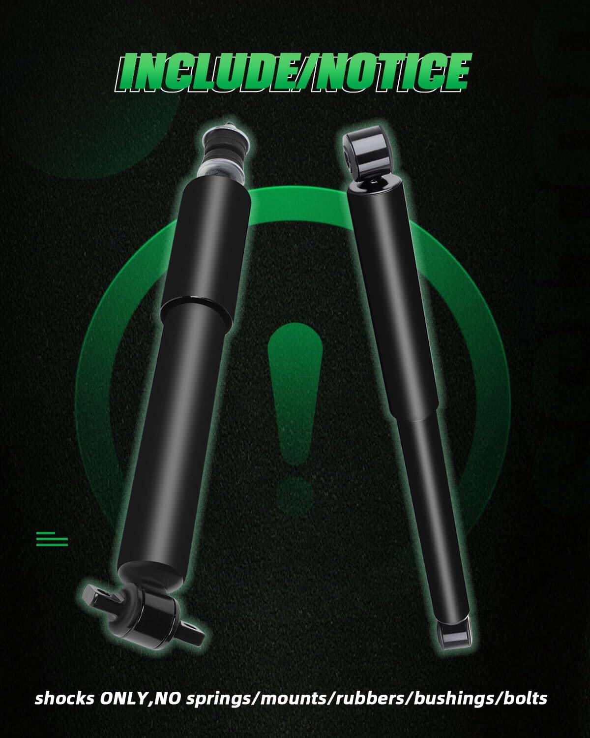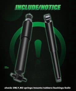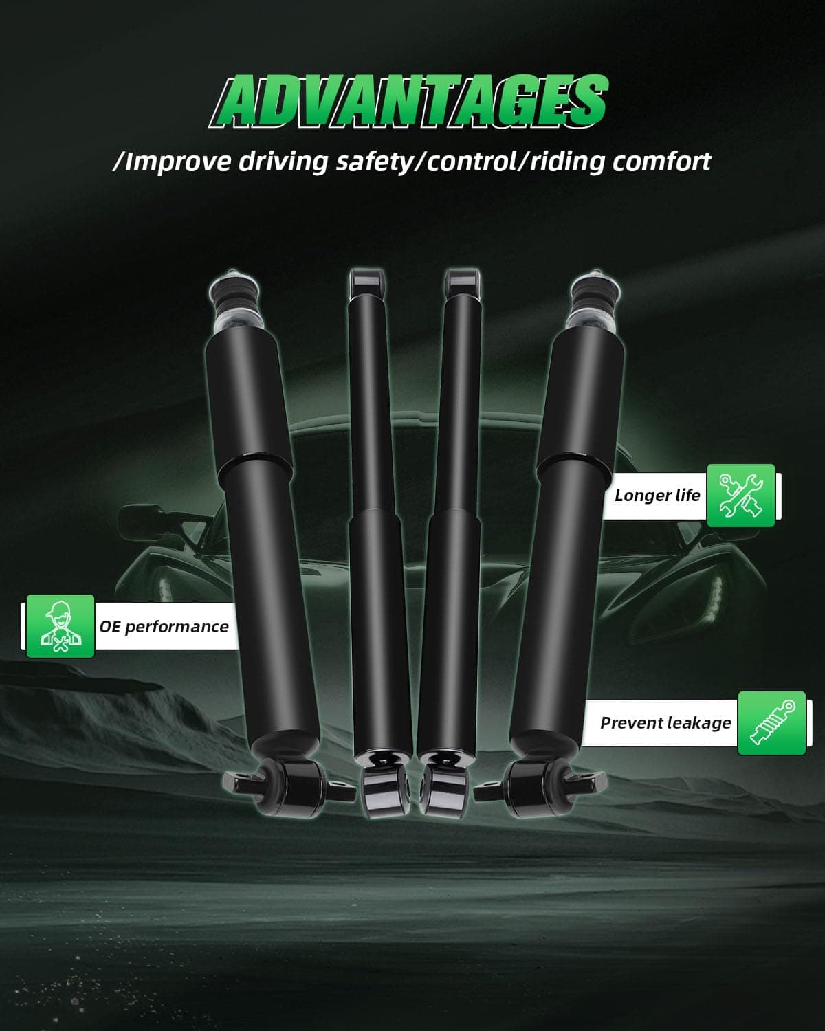 Características: 1. Fácil de instalar 2. Ajuste directo/exacto y calidad garantizada 3. Valvulación específica de la aplicación 4. Mejor filtrado de ruido de la carretera, vibración y dureza 5. Cargado de gas nitrógeno 6. Sellado mejorado para una vida útil más larga Compatibilidad Información: 1999-2007 Chevrolet Silverado 1500, 1999-2007 GMC Sierra 1500 Especificaciones: Ubicación en el vehículo: Delantero, Trasero, Izquierdo, Derecho. Reemplazo NO: 344380, 344365, 37149, 37150. Garantía: 1 año. Incluye: 4 amortiguadores. Consejos: 1. Para asegurarse de que el amortiguador no esté dañado, a veces se empaquetará y transportará en DOS paquetes. 2. Solo amortiguadores, no incluye muelles ni monturas.