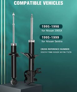 Características 1. Fácil de instalar 2. Ajuste Directo / Exacto y Calidad Garantizada 3. Valvulación Específica de Aplicación 4. Mejora de Filtración de Ruido de la Carretera, Vibración y Rudeza 5. Cargado con Gas de Nitrógeno 6. Sellado Mejorado para una Vida Más Larga Compatible con: 1995-1998 para Nissan 200SX 1995-1999 para Nissan Sentra Especificaciones: Tipo: Amortiguador Posición: delantero, trasero, izquierdo, derecho Piezas incluidas: 4 unidades de amortiguador Condición: Nuevo Número de Parte: 333219 333220 341194 71968 71969 71278 Tipo de ajuste: reemplazo directo / cargado con gas Color / Acabado: negro Garantía: 1 año Atención: 1. A veces, los amortiguadores pueden enviarse en 2 paquetes para protegerlos de posibles daños 2. Solo amortiguadores, no incluye resortes o montajes 3. Puede recibir amortiguadores en diferentes empaques, pero la calidad y función de los productos son los mismos