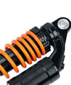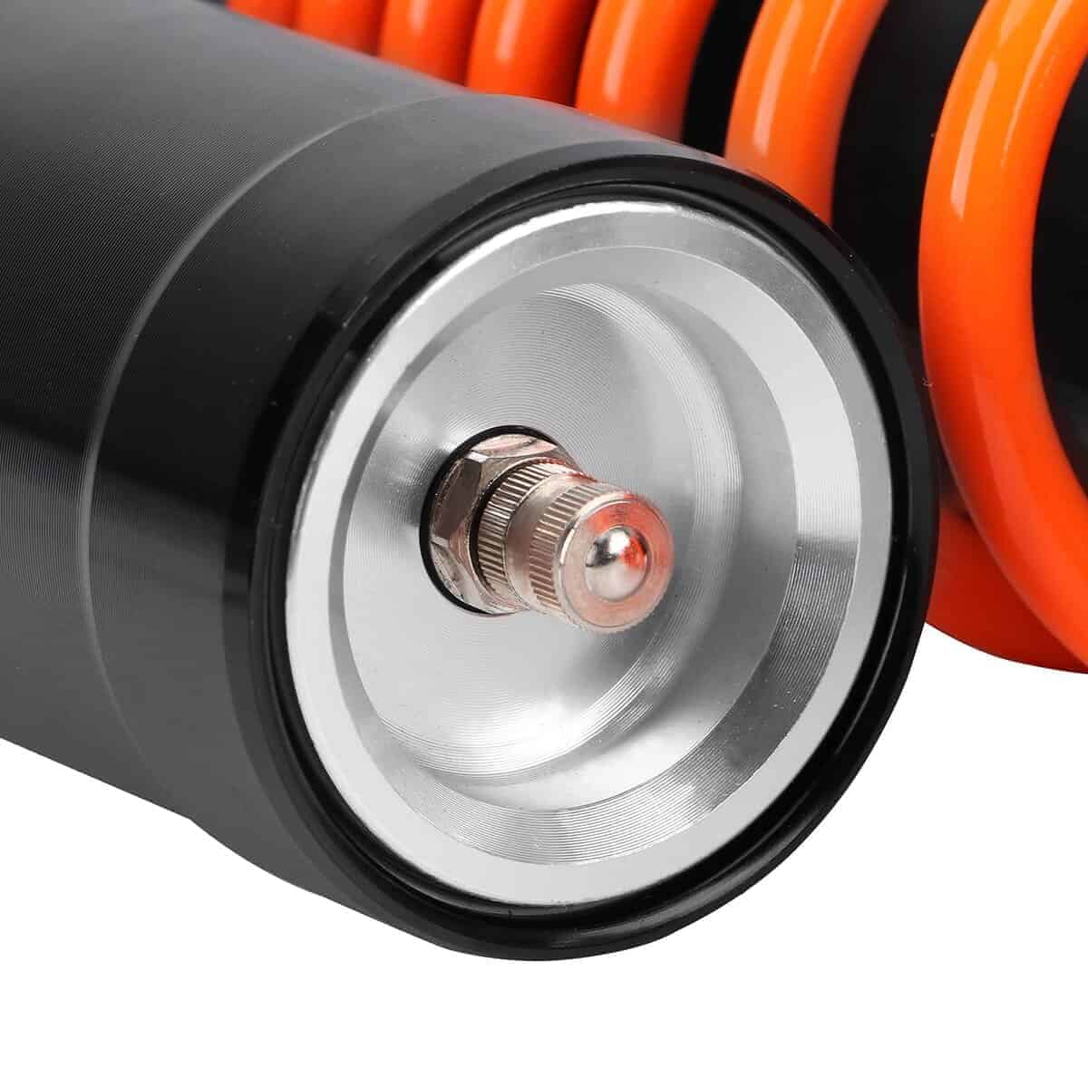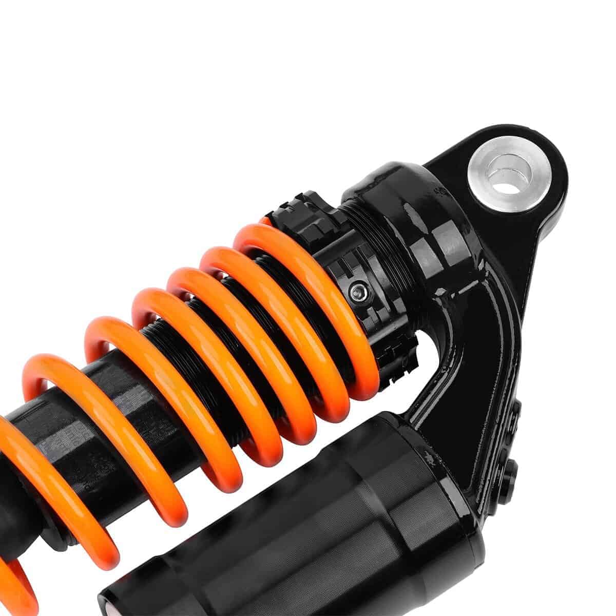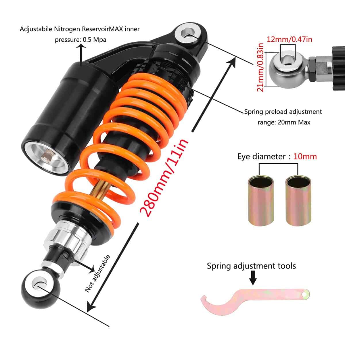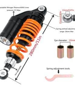 El amortiguador para motocicletas de 280 mm es adecuado para la mayoría de vehículos. Fabricado en aleación de aluminio CNC + acero de alta resistencia, resorte de alto rendimiento y un depósito de nitrógeno. Acero anticorrosión, resistente al agua, antidesgaste, apariencia personalizada. Longitud total: 315 mm (12 3/8 pulgadas). Diámetro del ojo (con manga): 12 mm. Resistencia a la tracción del ojo máximo: 2,000 kg. Rigidez del resorte: 110 kg. Carga máxima: 330 lbs / 150 kg. Paquete incluido Un par de amortiguadores, 1 x llave, 4 x casquillo.