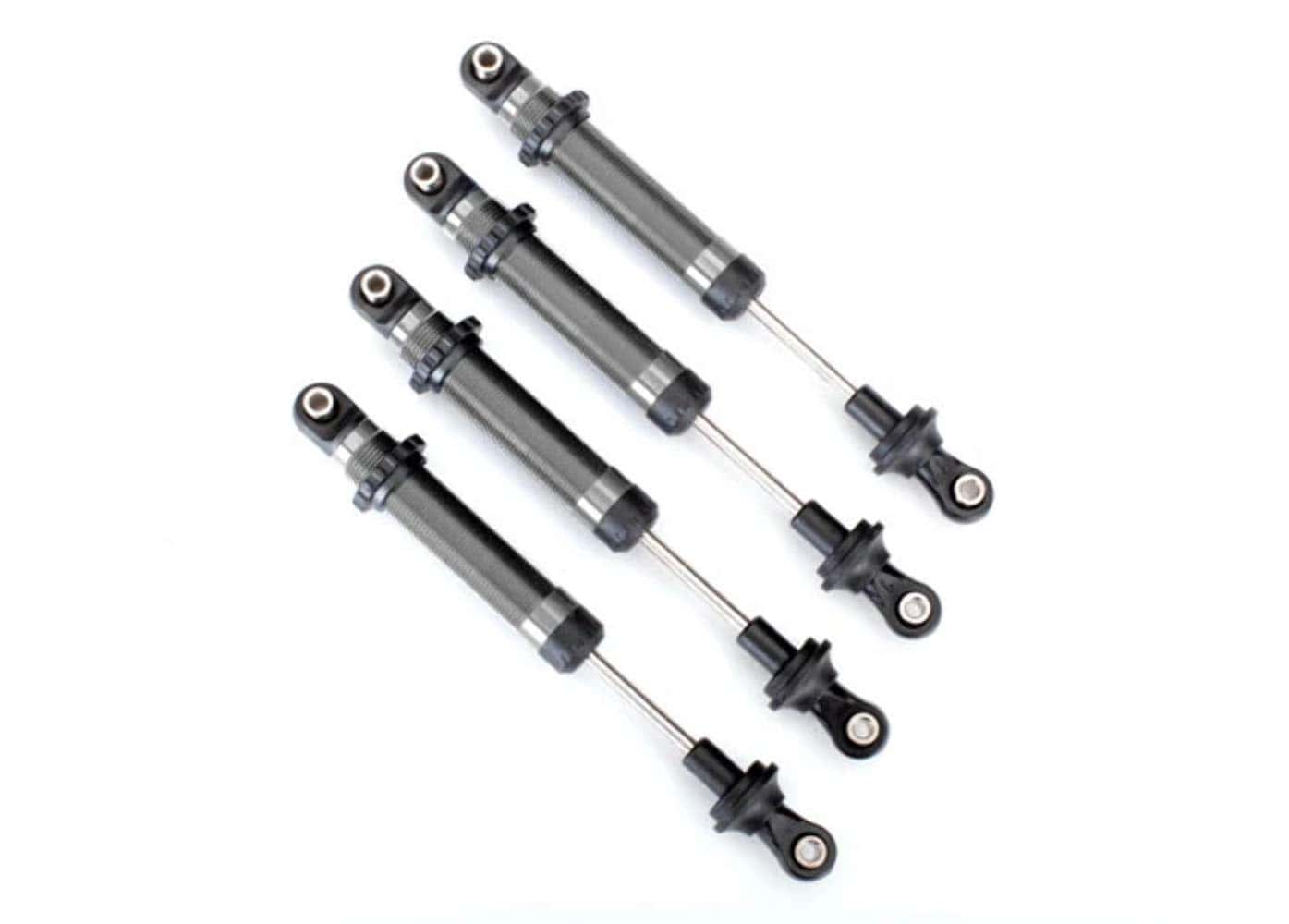 Amortiguadores Traxxas TRX-4 GTS de aluminio para brazos largos. Estos amortiguadores son compatibles con los camiones TRX-4 equipados con el kit opcional de brazos largos Traxxas. El paquete incluye cuatro amortiguadores preensamblados y una botella de aceite de amortiguador de peso no especificado. Resortes de amortiguador no incluidos.