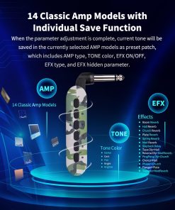 El amplificador de auriculares FX10 cuenta con 14 módulos de amplificador clásicos, elige el módulo de amplificador y ajusta el color de tono/efectos (y los parámetros de los efectos), luego el color de tono, tipo de efecto y parámetro se guardarán en el módulo AMP como un preset. Además, hay 14 efectos para elegir, como reverb, delay y modulación. Incluyendo 28 ritmos de batería con ajuste de parámetros, y 5 niveles de tono de color para una rápida optimización del tono. Admite conexión Bluetooth para conectar a dispositivos externos.