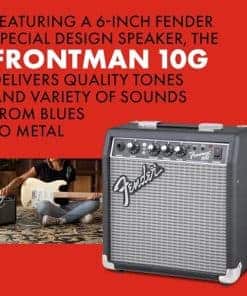 El Frontman 10G cuenta con una potencia de 10 watts en un altavoz Special Design de 6 pulgadas que ofrece excelentes tonos al practicar o tocar con amigos. Sus dimensiones son 7.5×11.5×13.7 pulgadas y pesa 11.7 libras. El altavoz de 6 pulgadas Fender Special Design ofrece tonos de calidad y una variedad de sonidos desde blues hasta metal. Disfruta de una amplia gama de controles, incluyendo ganancia, interruptor de selección de over-drive, volumen, agudos y graves. El diseño cerrado proporciona una respuesta de graves más profunda. Garantía limitada de 2 años: Los amplificadores Fender están diseñados para los músicos y fabricados con una calidad inigualable, incluso hasta el último tornillo. Fender garantiza este amplificador contra defectos de materiales y mano de obra durante dos (2) años a partir de la compra original.