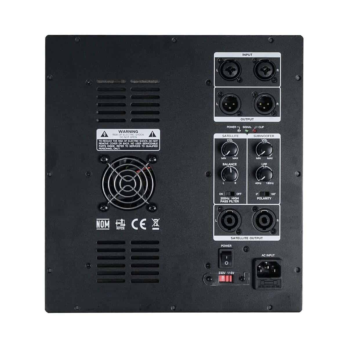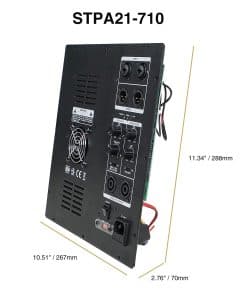 El amplificador de placa Sound Town Class-D te permite construir tu propio gabinete de subwoofer alimentado. El amplificador de potencia STPA21-710 está equipado con 2 entradas combo XLR-1/4 y 2 salidas XLR (through). Maneja una potencia formidable de 500W RMS. Cada salida de altavoz genera 125W RMS y te permite conectar dos altavoces pasivos PA con el amplificador. El amplificador de placa también viene con control de volumen principal, ajuste de Filtro Pasa Bajas (LPF) y un interruptor de polaridad. CARACTERÍSTICAS Amplificador de potencia de placa de 500W RMS Dos salidas de altavoz con 125W RMS de salida cada canal 2 entradas combo XLR-1/4, 2 salidas XLR (through) Protección contra sobrecorriente y cortocircuito Resistente y confiable ESPECIFICACIONES Modelo STPA21-710 Amplificador de placa de 2.1 canales (subwoofer + 2 satélites) Tipo Clase-D Impedancia Compatible con 4 y 8 Potencia 500W + 2 x 125W RMS Característica 2.1 canales, LPF Entrada 2 x XLR-1/4 combo (micrófono/línea) Salida 2 x XLR (thru) Control Subwoofer: volumen, LPF, polaridad; Satélite: volumen, HPF, balance Protección Protección contra sobrecarga y sobrecorriente Especificaciones técnicas LPF 40-300 Hz; HPF de 200Hz encendido/apagado Voltaje Conmutable 110V-220V Modelo de altavoz de referencia METIS-15/18SPW2.1, CARPO-15SPW Dimensiones y peso Ancho del producto (in.) 10.9″ Altura del producto (in.) 14.9″ Profundidad del producto (in.) 6.3″ Peso del producto (lb.) 17.9 lbs Garantías y certificaciones Garantía del fabricante 1 año SOPORTE