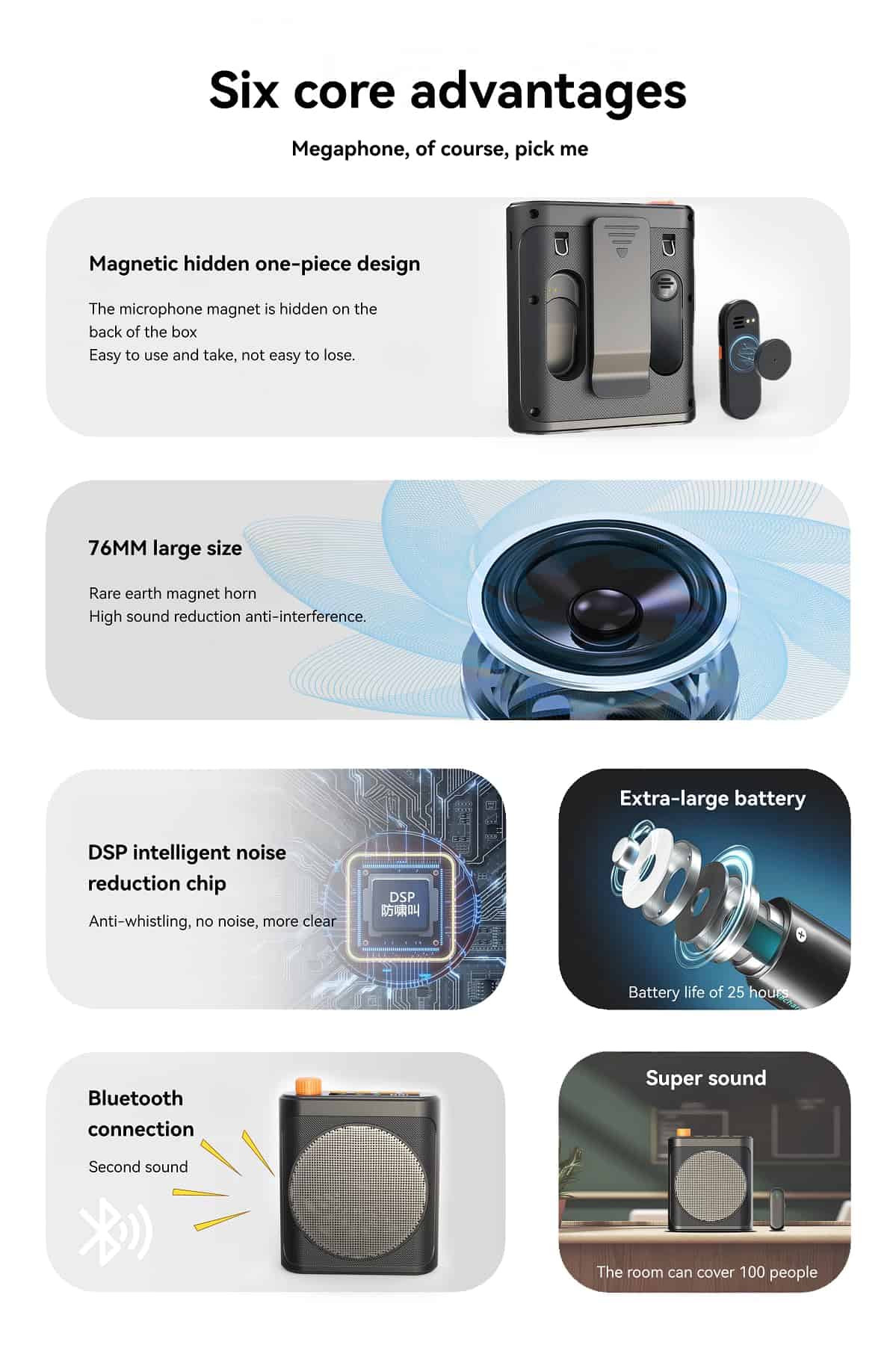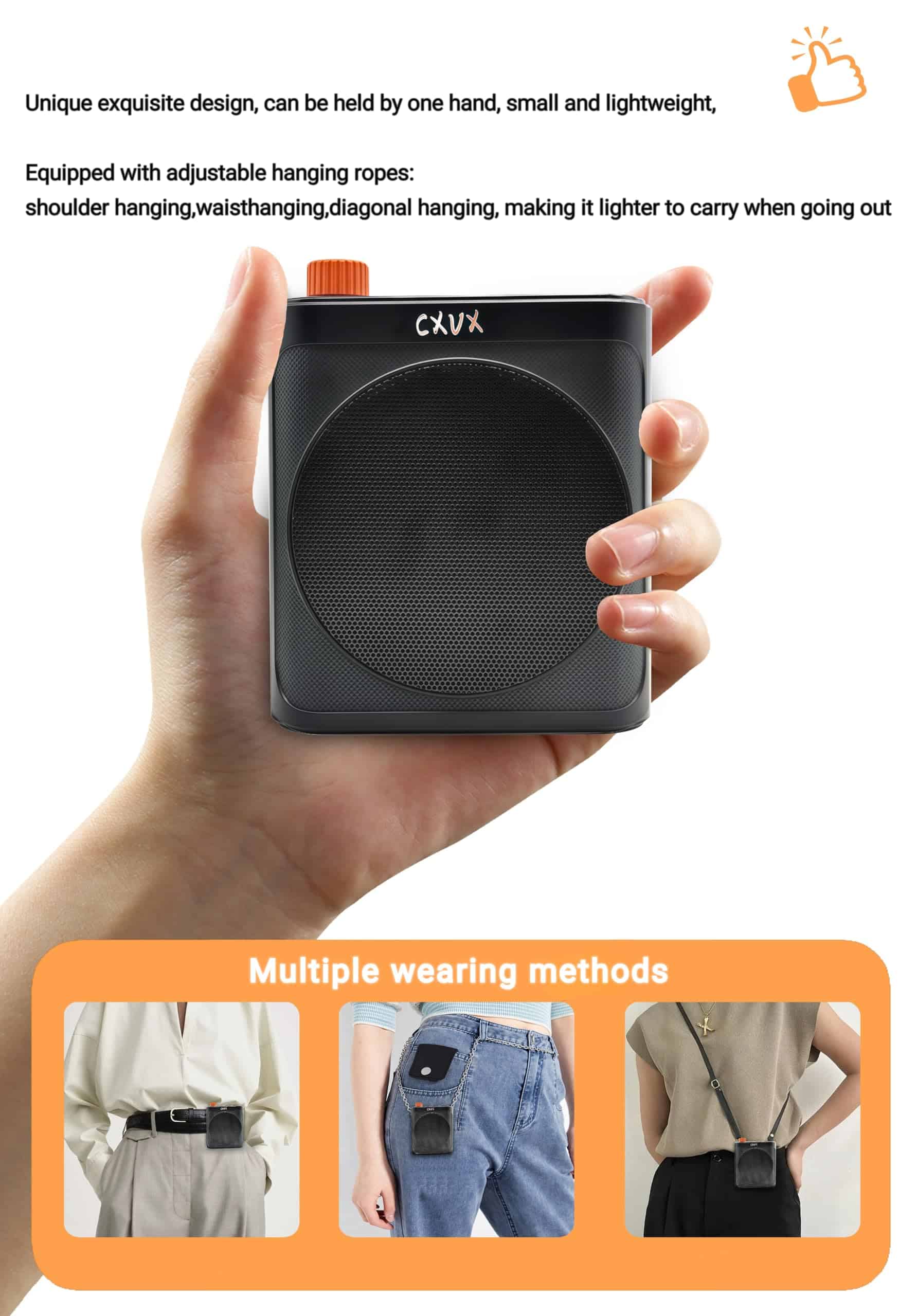 El Amplificador de Voz está equipado con una gran capacidad de batería de 2000MAH, que puede funcionar continuamente durante 24 horas. El micrófono inalámbrico se cargará automáticamente después de ser devuelto al anfitrión, sin necesidad de carga adicional. Además, el producto está equipado con 2 clips y correas para el hombro. Cuenta con un micrófono inalámbrico magnético dual de clip para collar para uso manos libres y una clara captación de audio. Nuestro micrófono de maestro para aula incluye dos micrófonos lavalier inalámbricos que se enganchan fácilmente a un collar o corbata. Este diseño brinda una clara ventaja al eliminar la incomodidad de los micrófonos de diadema tradicionales. Aligera en gran medida la carga docente, haciendo que la instrucción en el aula sea más cómoda y eficiente. Dos micrófonos se pueden usar simultáneamente o por separado, no hacen ruido. El micrófono inalámbrico se conectará automáticamente con el amplificador al encenderse, con una distancia de transmisión estable de hasta 20 metros, asegurando que su voz se amplifique de manera efectiva. Uso Versátil, Ideal para maestros, entrenadores, guías turísticos y otros profesionales que necesitan proyectar su voz claramente. Ligero y portátil: el micrófono portátil con altavoz con diseño ligero y tamaño pequeño. El diseño de 5.6 1.9 pulgadas y un peso de solo 225 g son perfectos para llevar a personas que necesitan amplificar su voz y ahorrar garganta.
