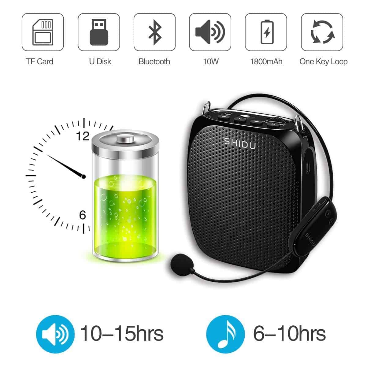 Amplificador de voz portátil con diseño ergonómico y cómodo. Potencia de 10 W con rango de sonido de hasta 800 sq ft. Sistema electroacústico de amplificador acústico Shidu. Micrófono especial Shidu con tecnología de mejora de sonido Hi-Fi. Compatible con tarjeta TF y memoria flash U disco. Batería de litio de 1800 mAh. Potencia máxima de salida: 10 Watts. Respuesta de frecuencia: 90 Hz – 18 kHz. Temperatura de trabajo: -10 a 45 grados. Voltaje de carga: DC 5 V 500 mA. Tiempo de funcionamiento extendido: 8 a 12 horas. Tiempo de reproducción de música: 6 a 10 horas. Tiempo de carga: 3 a 5 horas. Tamaño del producto: 3.18 x 2.58 x 1.26 pulgadas. Contenido de la caja: 1 Amplificador de voz, 1 Cable de carga USB, 1 Cinturón, 1 Transmisor inalámbrico, 1 Manual de usuario.