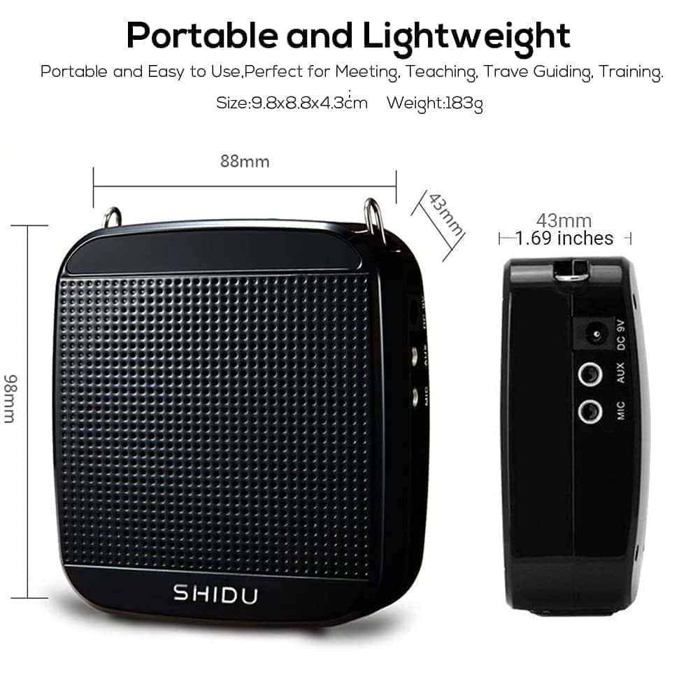 Este amplificador de voz inalámbrico de 18W SHIDU S613 es un gran salvador de voz donde puedes hacer presentaciones con el auricular inalámbrico y todos en la habitación te oirán fuerte y claro. También admite Bluetooth, tarjeta TF y unidad USB, lo que te permitirá disfrutar de la maravillosa música después del trabajo. La entrada de audio Aux te permite usarlo como altavoz con tu computadora, portátil, escritorio, iPad o teléfono. Especificaciones: Potencia de salida: 18W Capacidad de la batería: 2200mAh Respuesta de frecuencia: 80Hz-18KHz Voltaje de carga: DC9V, 1200mA (Para altavoz), DC5V, 500mA (Para micrófono) Tiempo de trabajo: 6-8 horas (Modo MIC con cable); 6-8 horas (Modo musical); 4 horas (Micrófono inalámbrico). (Depende del volumen que controles) Tiempo de carga: 3-5 horas para el amplificador de voz; 2-3 horas para el micrófono Cobertura de sonido: 10000 pies cuadrados Temperatura de trabajo: -10 a 45 Tamaño del producto: 98mm x 88mm x 43mm Peso unitario: 183g / 0.4lb. Qué hay en la caja: 1 x Amplificador de voz 1 x Micrófono inalámbrico UHF 1 x Cinturón 1 x Cable de audio 1 x Cable USB 1 x Cargador DC 9V (Para el amplificador de voz) 1 x Cargador de pared 5V (Para el micrófono) 1 x Manual del usuario. Consejos: 1. No insertar o enchufar el conector con frecuencia para evitar la aflojamiento de la conexión. 2. Por favor, distinguir entre el enchufe del MIC y AUX. 3. Antes de usar, baja el volumen y luego ajusta el volumen según tus necesidades. 4. Se sugiere utilizar accesorios originales si es necesario reemplazarlos. Ofrecemos una política de devolución fácil y reembolso completo en tu compra en un plazo de 30 días, y una garantía de 1 año a partir de la fecha de compra. Si necesitas asistencia, no dudes en contactarnos.