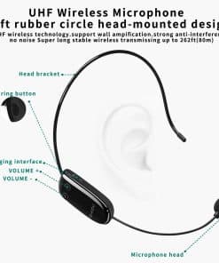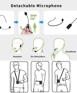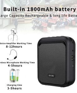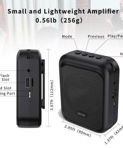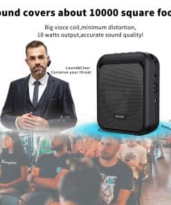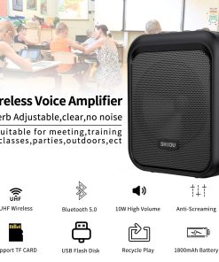 Operación fácil de usar: solo conecta el auricular y enciende el altavoz. Pequeño y ligero: puedes llevar este mini amplificador de voz alrededor de la cintura o colgarlo en el cuello con la ayuda de una banda para la cintura. Uno de los mejores beneficios es que puede funcionar bien para personas mayores que no pueden proyectar su voz y mantenerlos socialmente involucrados. También es útil para aquellos que tienen problemas con el volumen vocal. Admite unidades flash USB Bluetooth Tarjeta TF. Sistema de micrófono UHF: No es un Micrófono Bluetooth. El micrófono inalámbrico 2 en 1 solo se usa para amplificación de sonido. Utiliza la tecnología de transmisión inalámbrica UHF, la transmisión de señal es más rápida y estable que la tecnología de 2,4G y FM, unos 20m/65ft de distancia de conexión inalámbrica en un área abierta. Especificaciones: Potencia de salida máxima: 10W Impedancia de salida: 4Tensión de carga: DC 5V 500mA Tiempo de reproducción de música: 6-10 horas Respuesta de frecuencia: 90Hz-18KHz Temperatura de trabajo: -10 -45 Tiempo de carga: 3-5 horas Tiempo de trabajo: 8~10 horas (Dispositivo principal), 3~5 horas (Micrófono inalámbrico)