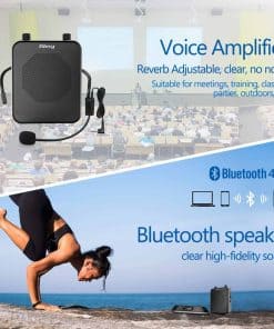2. Amplificador de voz Bluetooth – No solo un amplificador, este dispositivo también funciona como un altavoz Bluetooth portátil. Reproduce tu música favorita de forma inalámbrica desde cualquier dispositivo móvil con Bluetooth, con un alcance de hasta 33 pies. Ahora puedes disfrutar de tus canciones mientras disfrutas de los beneficios de la proyección de voz amplificada.