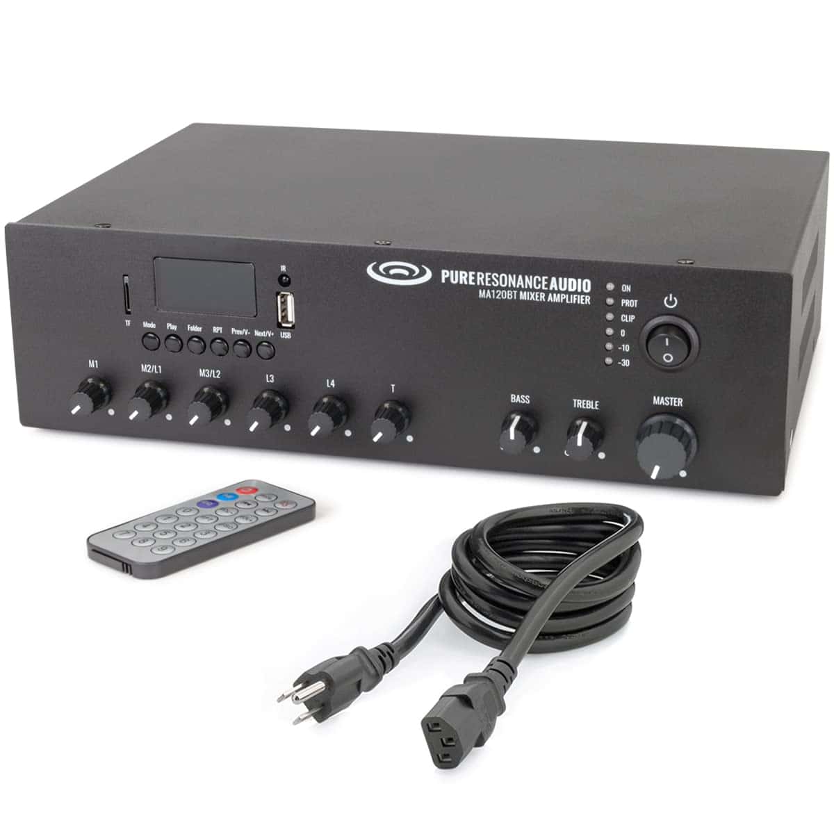Este amplificador mezclador de 7 canales de Pure Resonance Audio con tecnología de transformador 70V/100V incorporada proporciona una solución simple y confiable de 6 entradas con un reproductor de medios Bluetooth incorporado para su instalación en aplicaciones comerciales. Entradas balanceadas y no balanceadas, salidas de 70 Voltios, 100 Voltios, 8 ohmios o 4 ohmios, y tamaño compacto e interfaz se combinan para que este amplificador mezclador sea una opción fácil para cualquier aplicación que necesite música de fondo y anuncios generales. Es perfecto para su uso en restaurantes, tiendas, oficinas, escuelas, hospitalidad, etc. y está equipado con paging y MOH (Música en espera).