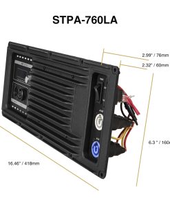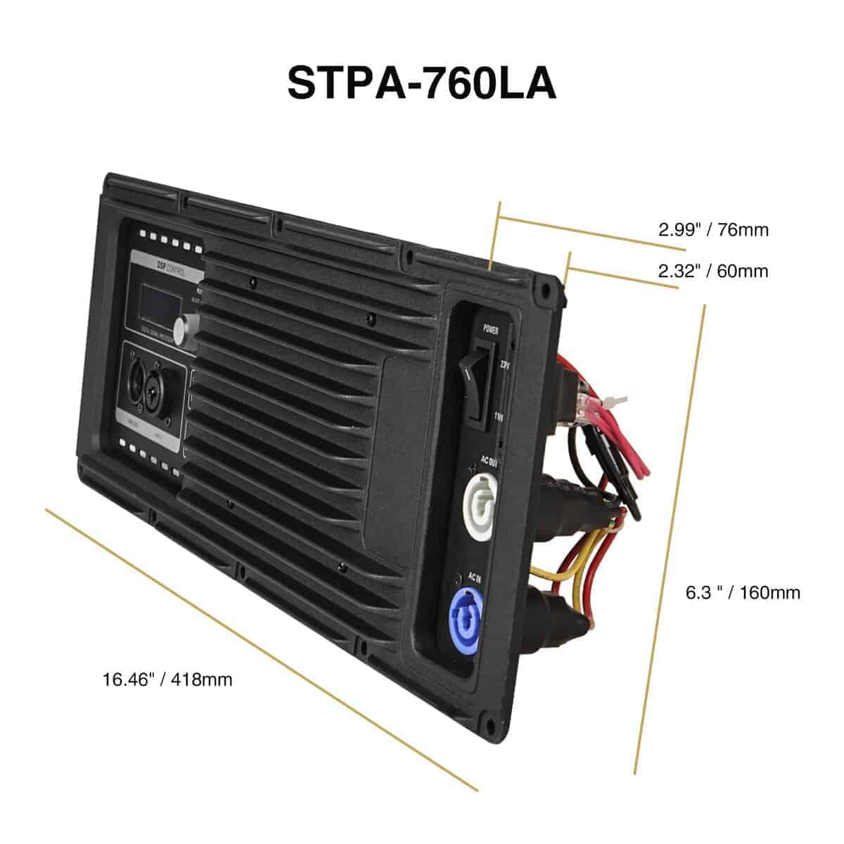 Amplificador Plateado de Clase-D Sound Town 550W Continuos, con DSP, para Gabinetes de Bocinas de PA DJ y Altavoces (STPA-760LA) Presentamos el amplificador de placa Sound Town STPA-760LA: un amplificador clase-D de 2 canales confiable y potente que ofrece una impresionante salida continua de 450W (LF) + 100W (HF) a 8 , asegurando un rendimiento excepcional de rango completo en todo momento. El amplificador STPA-760LA viene con una versátil entrada combo XLR-1/4″ y una salida XLR, lo que facilita la conexión a cualquier sistema de sonido. La pantalla LCD incorporada no solo tiene un aspecto elegante, sino que también permite a los usuarios personalizar la configuración de su dispositivo de audio con una precisión milimétrica, gracias a sus menús editables fáciles de usar. Si eso no fuera suficiente, el procesador de señal digital (DSP) integrado viene equipado con 4 presets y ajustes manuales. Esto permite una ecualización de 3 bandas, refuerzo de graves y controles de retardo meticulosamente afinados, garantizando la calidad de sonido ideal para cada ocasión. El STPA-760LA está diseñado para durar con su construcción robusta, cuenta con protección contra sobrecorriente y cortocircuitos. Además, el panel integrado de disipador de calor de aluminio garantiza que el dispositivo se mantenga fresco, garantizando un rendimiento confiable, duradero y sin preocupaciones. Experimenta el audio como nunca antes con el amplificador Sound Town STPA-760LA.