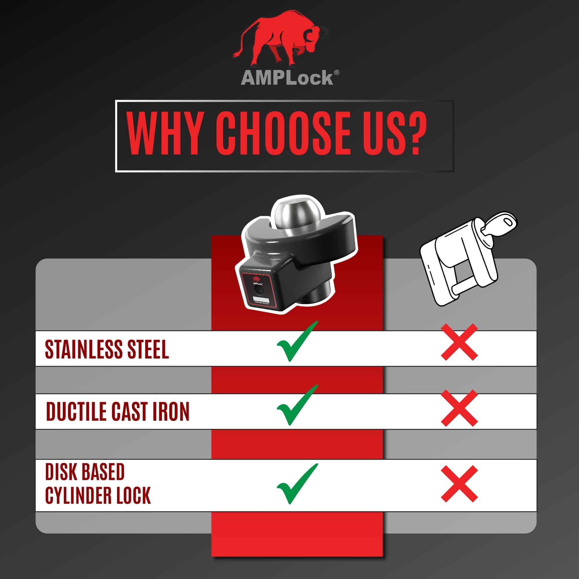 Proteja su remolque o caravana (RV) con el mejor bloqueo de enganche, los exclusivos bloqueos de AMPLOCK son los más resistentes y confiables del mercado actual. Nuestro producto único está hecho con los siguientes materiales de alta calidad: acero inoxidable, hierro fundido dúctil 65000 y acero tratado térmicamente, para proporcionar años de confiabilidad y durabilidad. Los bloqueos están hechos de buena resistencia a la oxidación asegurando un uso a largo plazo en exteriores en diferentes climas. Para aumentar la seguridad, cada bloqueo AMPLOCK tiene su propia llave única y utilizamos un bloqueo de disco junto con un sistema de llave de control e identificación. Puede disfrutar de la vida sin preocupaciones con el mejor bloqueo de enganche. Nuestros diferentes modelos están moldeados para adaptarse a la forma específica del enganche de su remolque o caravana (RV) cuando está desenganchado, por lo que su bloqueo AMPLOCK es el perfecto disuasivo contra robos. Asegúrese de elegir el modelo correcto para el tamaño y tipo de enganche de su remolque o caravana (RV), consultando las imágenes proporcionadas (las fotos son solo para referencia visual) o nuestro sitio web www.amplock.us