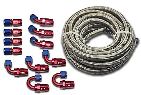 EL PAQUETE INCLUYE Manguera de combustible de acero inoxidable AN-10 x 30 pies Accesorio recto AN-10 x 4 Accesorio de 45 grados AN-10 x 3 Accesorio de 90 grados AN-10 x 3 Accesorio de 180 grados AN-10 x 2 Esta manguera de combustible trenzada de acero inoxidable está especialmente diseñada para trabajar en cualquier proyecto automotriz. Esta manguera le proporciona niveles insuperables de rendimiento y confiabilidad para sus aplicaciones de alto rendimiento. Esta manguera es ideal para alta temperatura, alta presión y ofrece una amplia gama de compatibilidad de fluidos. Esta manguera está hecha de poliuretano de alta calidad en el interior que le otorga alta resistencia química y térmica, junto con un trenzado de acero inoxidable en el exterior que le otorga una alta durabilidad, resistencia extrema a la presión y una apariencia profesional y de alta tecnología. Son de diámetro interior liso para un flujo óptimo. El poliuretano es flexible y fuerte y cuando se combina con la trenza de acero inoxidable puede funcionar bajo condiciones de alta presión, flexión continua y vibración.