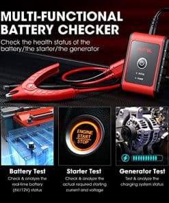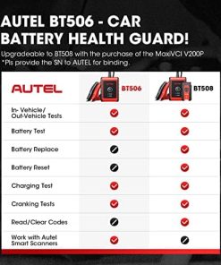 Analizador de Baterías Autel MaxiBAS BT506, Probador de Baterías de Coche 2022 para 6V & 12V, 100-2000 CCA, Pruebas de Batería/Arranque/Generador para Arranque, Carga y Sistemas de Batería con Informes de Prueba: Este probador de baterías de coche Autel BT506 puede comprobar baterías de coche 6V & 12V 100-2000CCA, incluyendo baterías de inundación, AGM en espiral, AGM, EFB y GEL. Al mismo tiempo, este analizador de baterías de coche es compatible con estándares de CCA, CA, SAE, EN, JIS, IEC, DIN y MCA y proporciona un análisis preciso y seguro de la salud de las baterías con antelación antes de que mueran las baterías, asegurando que conduzcas de manera segura. El método avanzado de análisis de baterías Conductancia Adaptativa examina de manera más precisa la capacidad de arranque en frío y la capacidad de reserva de la batería y es vital para determinar la verdadera salud de una batería. Utilizando la Conductancia Adaptativa, el analizador de baterías de Autel BT506 incrementa la tasa de precisión de las pruebas al 94.11%, la tasa de detección de baterías malas al 63.55%, y reduce la carga y la nueva prueba en un 30.03%, mucho más rápido y con mayor precisión que otros competidores. El probador de baterías Autel 2022 BT506 prueba las baterías tanto en el vehículo como fuera del vehículo, e incluso prueba las baterías muertas. La prueba en el vehículo incluye la prueba de batería (para 6V & 12V), prueba de arranque (para 12V), & prueba de generador (para 12V) para verificar el estado de salud de la batería/arranque/generador respectivamente. La prueba fuera del vehículo verifica las baterías de 6V & 12V solamente sin conexión al vehículo, lo que prueba solo el estado de salud de la batería. La Prueba de Arranque te ayuda a analizar el sistema de arranque, incluyendo el voltaje de arranque real y el tiempo de arranque, y verifica si el motor de arranque funciona correctamente o no. La Prueba de Generador de este probador de baterías de 12V de Autel verifica el estado de salud del sistema de carga, incluyendo la ondulación, voltaje cargado y voltaje en vacío, y evita el daño de la batería de 12V debido a la sobrecarga o la carga incompleta. Con operación basada en APP, el analizador de baterías orientado al usuario BT506 ha sido optimizado en velocidad y precisión. Comprueba rápidamente la batería, muestra los resultados de la prueba y te recuerda el mantenimiento oportuno de la batería a través de la APP en dispositivos iOS/Android. Además, compatible con los escáneres inteligentes de Autel, como MS906S, MS906 Pro, MS906 Pro-TS, MaxiSys Elite2, etc., este probador de baterías de coche te brinda soluciones de batería exhaustivas y completas.