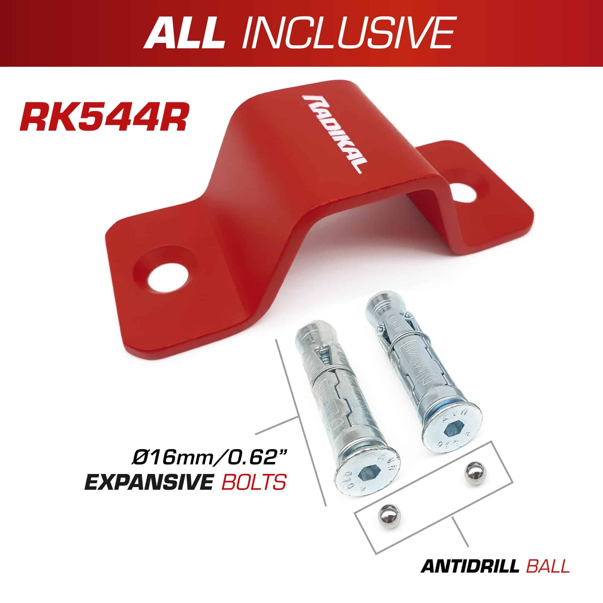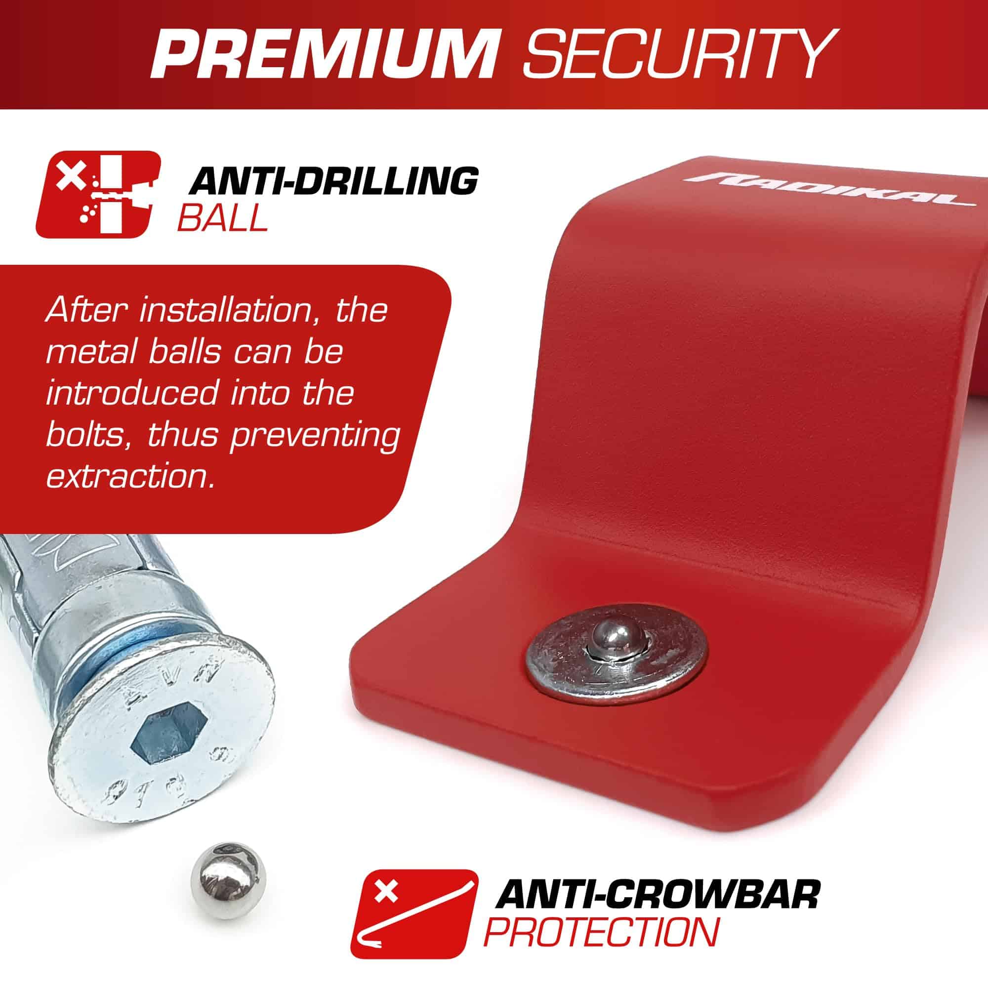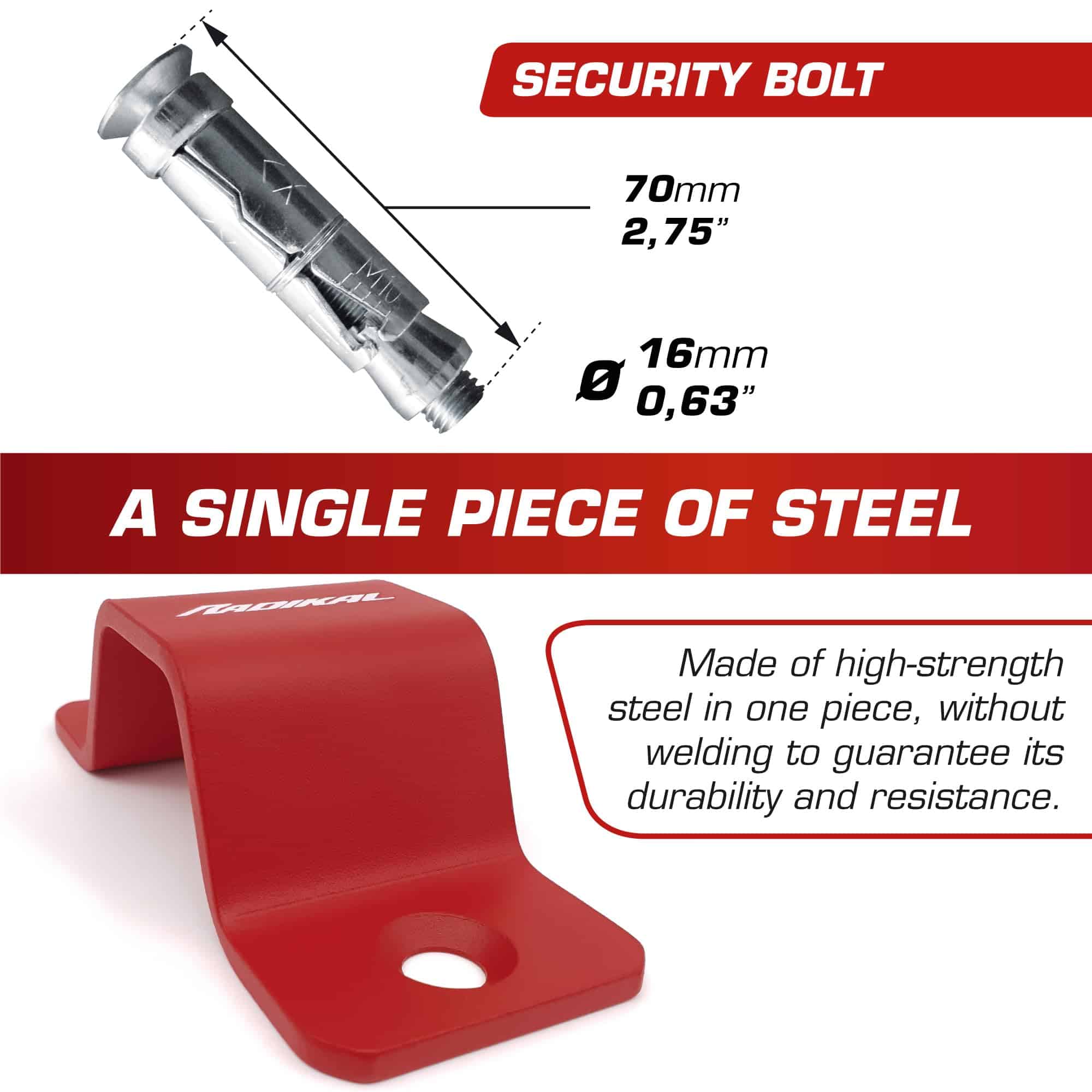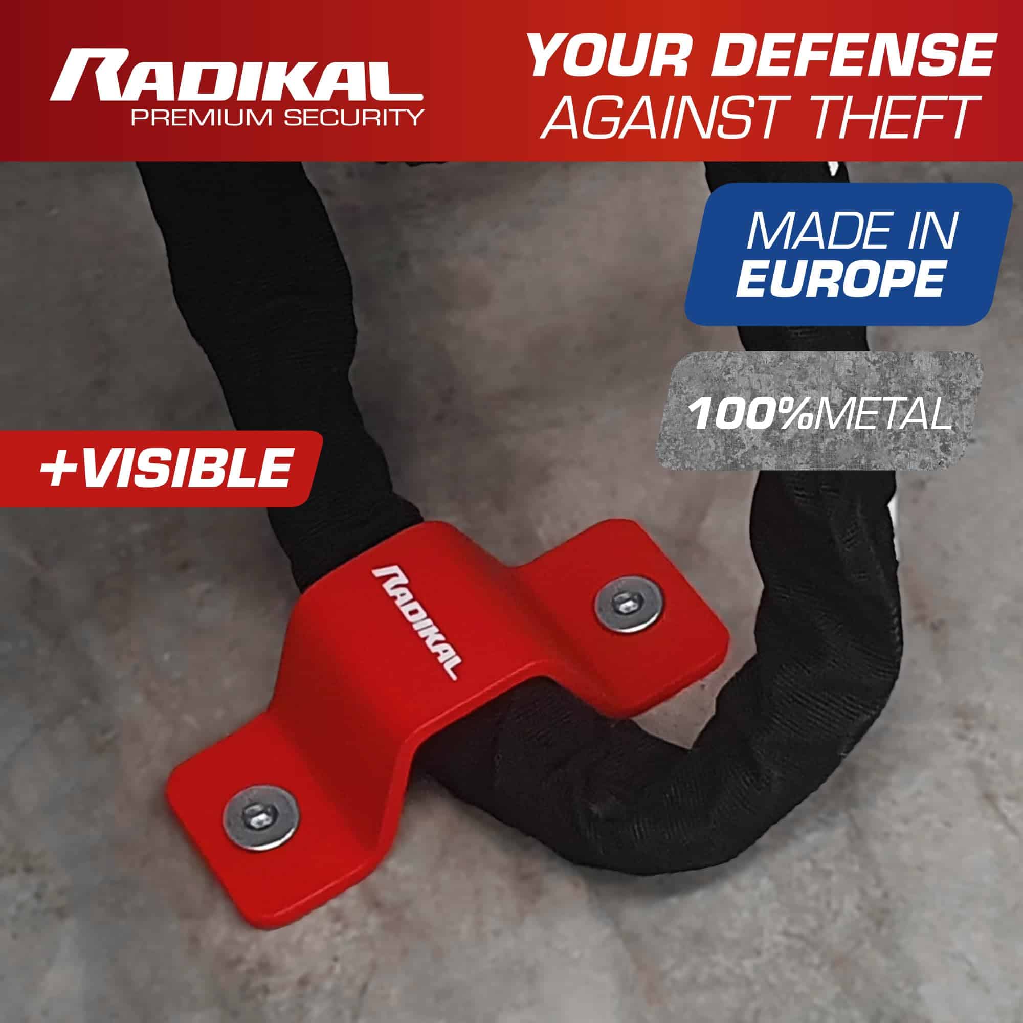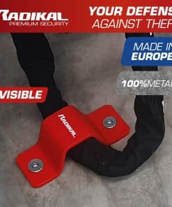 El RADIKAL RK544R es un ancla de suelo de seguridad para asegurar tu bicicleta, scooter o motocicleta combinada con un candado de cadena de alta seguridad. Con medidas y tamaño universales y óptimos, fácil de instalar por ti mismo. Fabricado por RADIKAL.