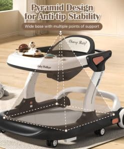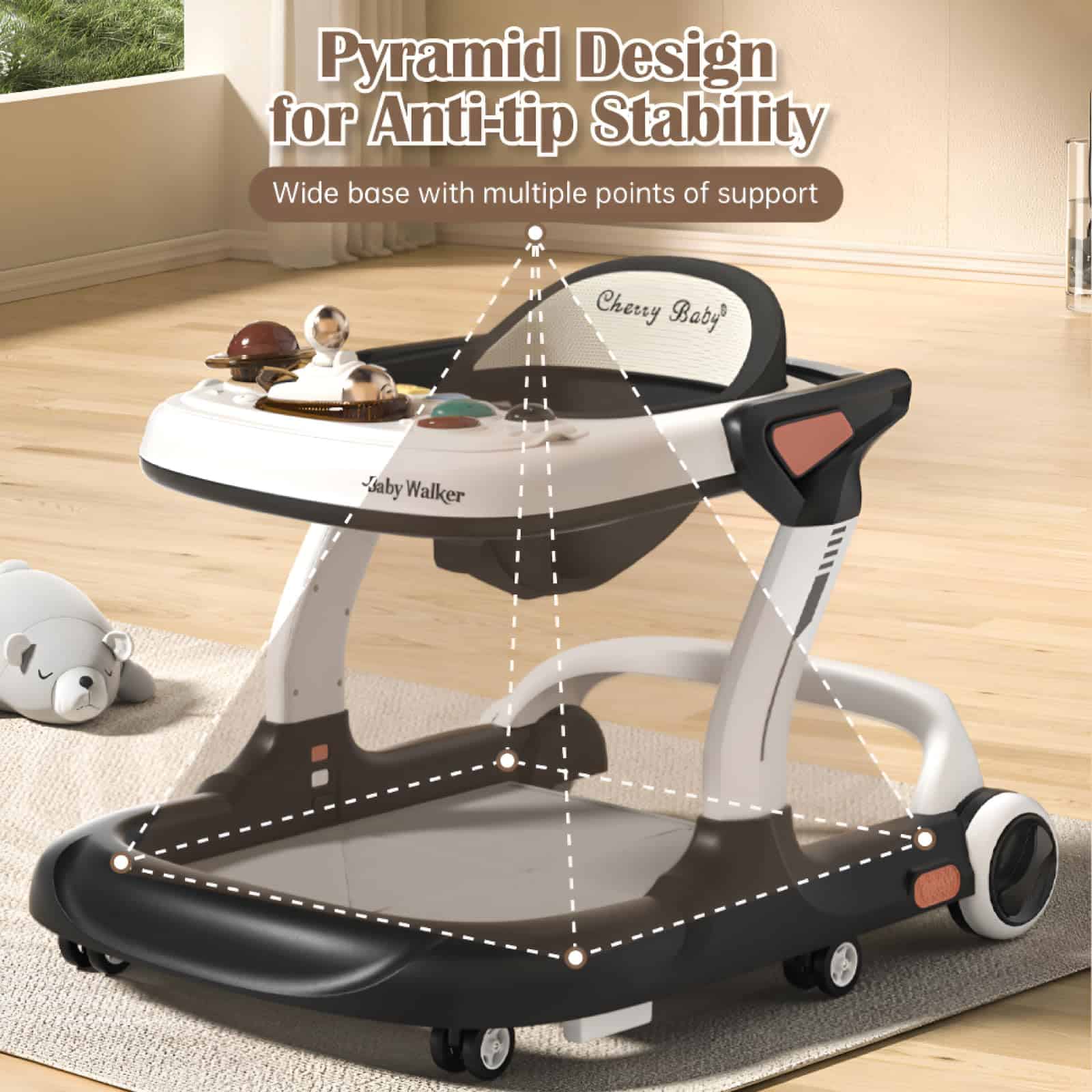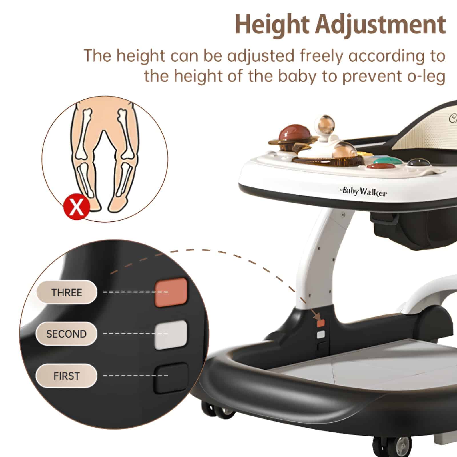 Proteger la seguridad del bebé. Andadores para bebés versión 2.0, diseño de chasis ampliado, mayor estabilidad, equipado con bloques de freno en la parte inferior para evitar que se rueden por escaleras y baches, y dos grandes ruedas traseras de goma ajustables, totalmente silenciosas mientras aumentan la fricción para evitar resbalones y poder ajustar la velocidad de deslizamiento de las ruedas traseras más adecuada para el bebé según la edad y la vida cotidiana del bebé, para que el bebé aprenda a caminar de manera más suave y segura.