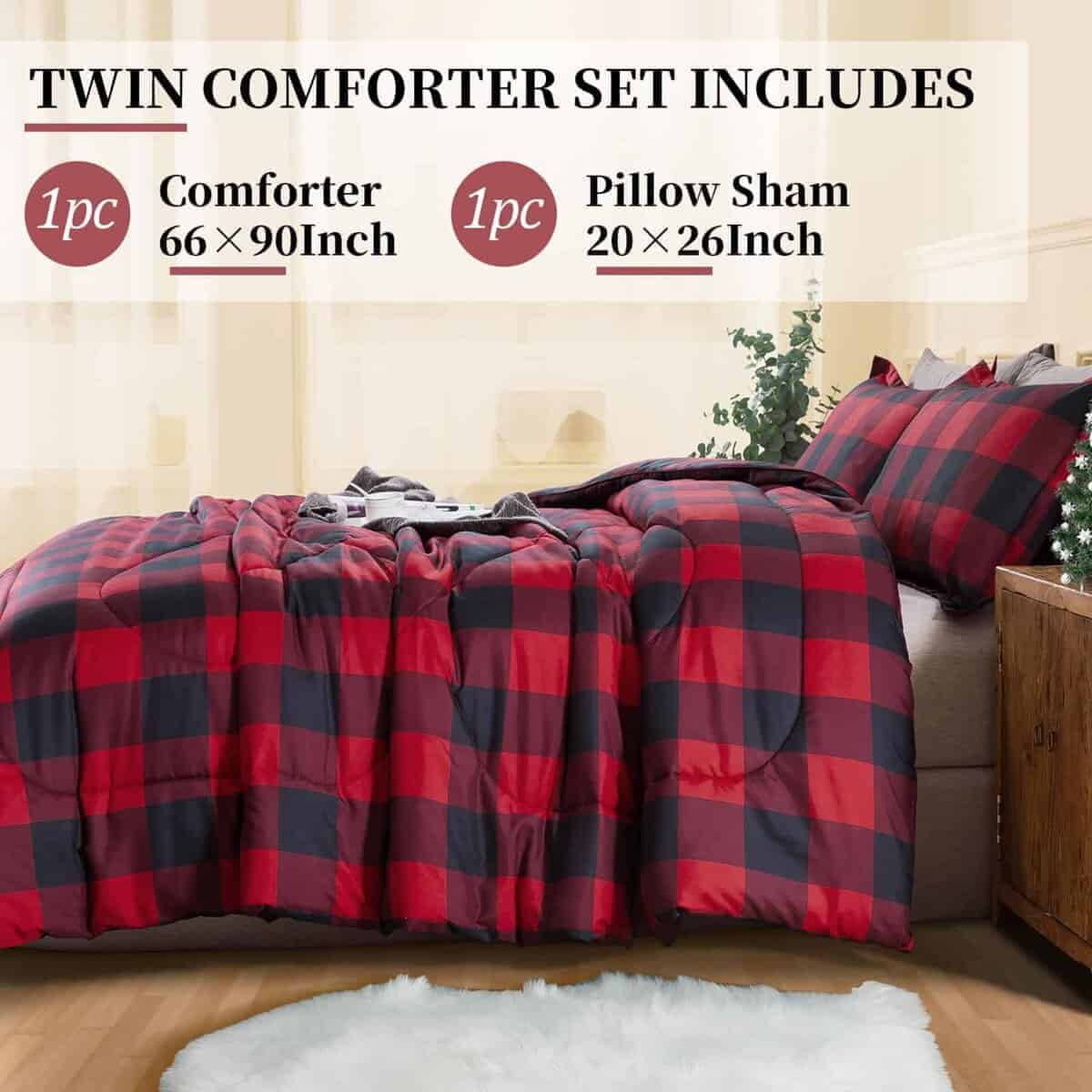 1. Juego de colcha a cuadros twin Nuestro juego de colcha a cuadros rojo viene en 2 piezas, incluyendo 1 Colcha de Cuadros Roja (66″x90″) y 1 Funda de Almohada (20″x26″). Este juego de colcha twin de cuadros se puede utilizar como inserto de edredón o como colcha independiente. Ya no necesita una cubierta adicional, lo que puede ahorrarle tiempo al cambiar las cubiertas de la ropa de cama. Puede obtener convenientemente un juego de ropa de cama en un solo paquete en lugar de comprar cada artículo por separado, lo cual cuesta más dinero.