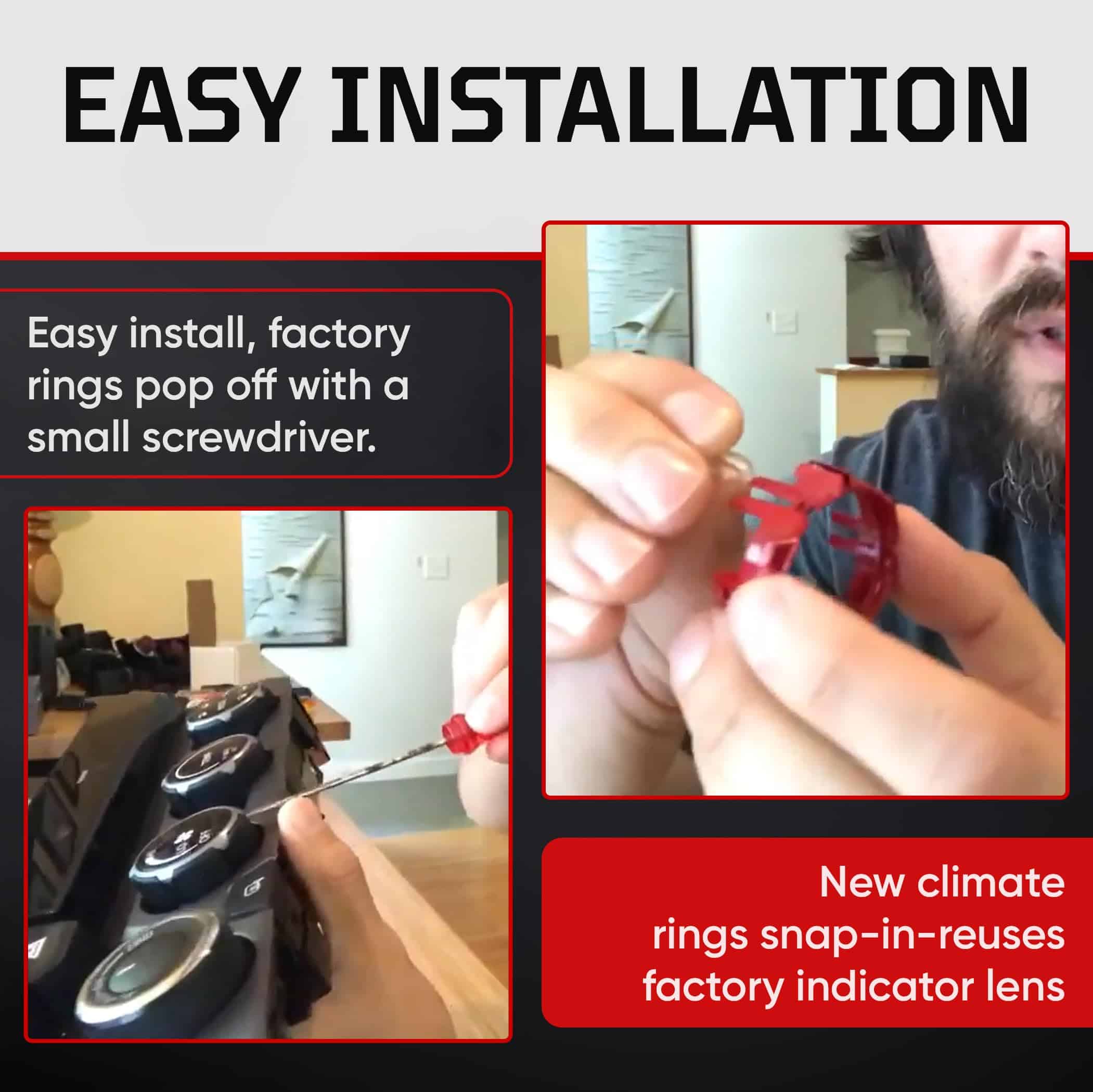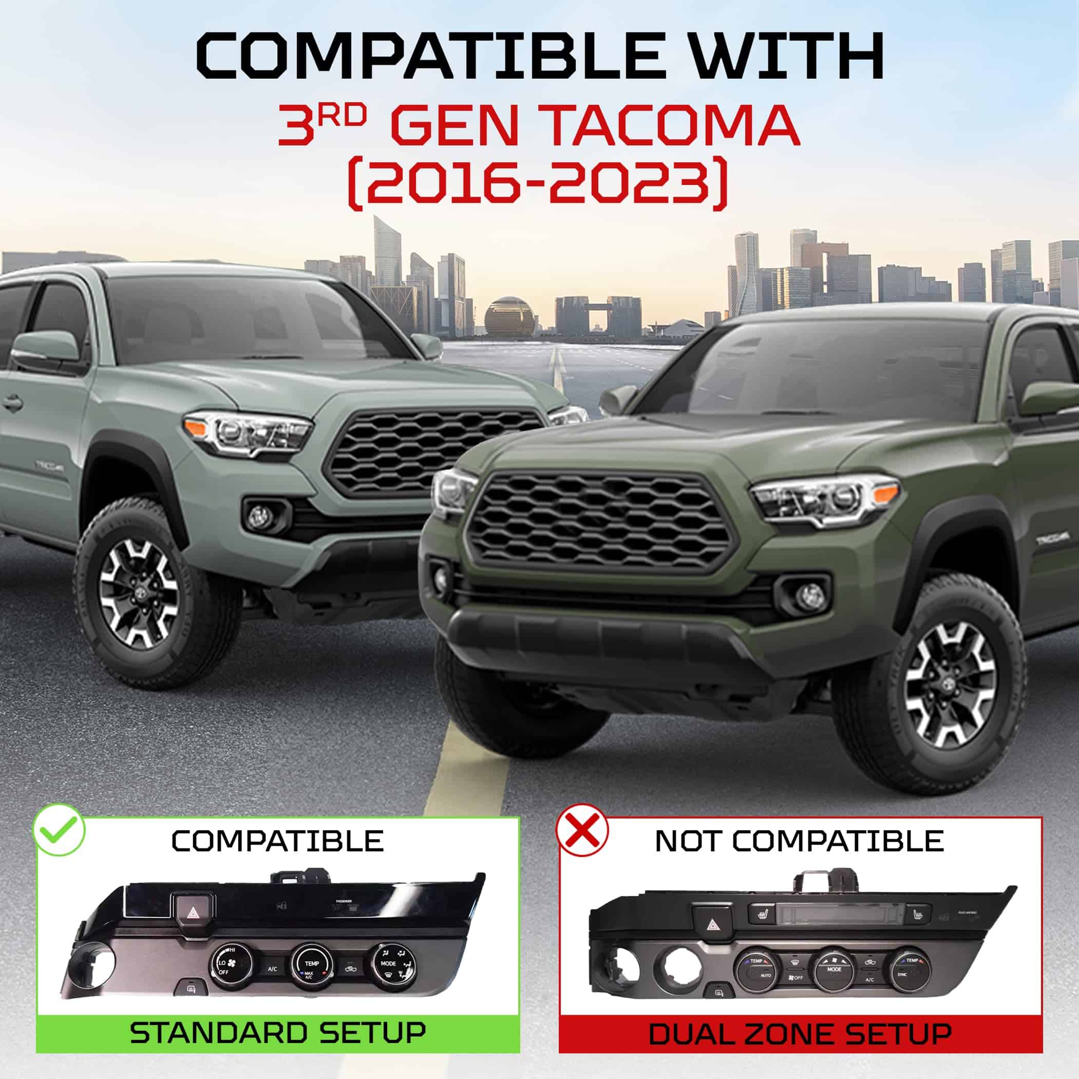 2. DISEÑADOS PARA MODELOS TACOMA 2016-2023: Compatibles con el control de clima en Tacomas 2016-2023, no son compatibles con el control de clima de doble zona. Estos anillos se instalan perfectamente en su lugar. No se requiere adivinanza ni modificaciones especiales, simplemente retire los anillos de fábrica y reutilice la lente indicadora original para mantener visibles los ajustes de temperatura.