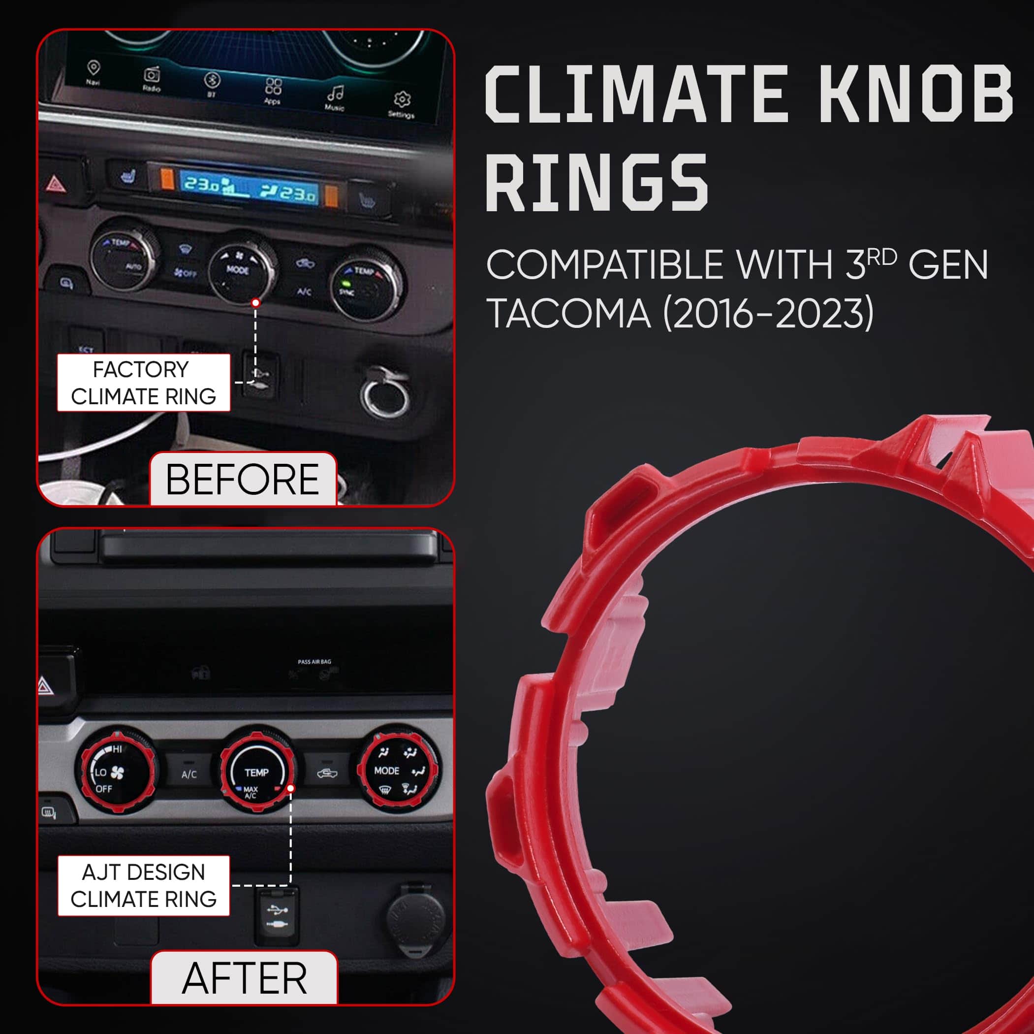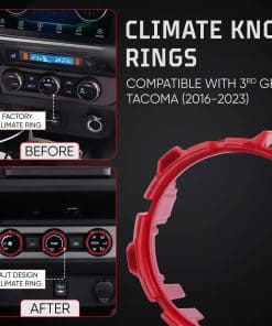 1. ELEVA EL INTERIOR DE TU TACOMA: Cansado de los anillos de fábrica aburridos y desgastados, los anillos de perilla de clima rojos de AJT Design complementan perfectamente el interior de tu camioneta, creando un aspecto moderno y cohesivo. Diseñados para reemplazar las piezas OEM de fábrica, cada anillo mejora al instante el aspecto del módulo de control de clima; perfecto para cualquier persona que busque accesorios geniales y compatibles para interiores de Toyota Tacoma.