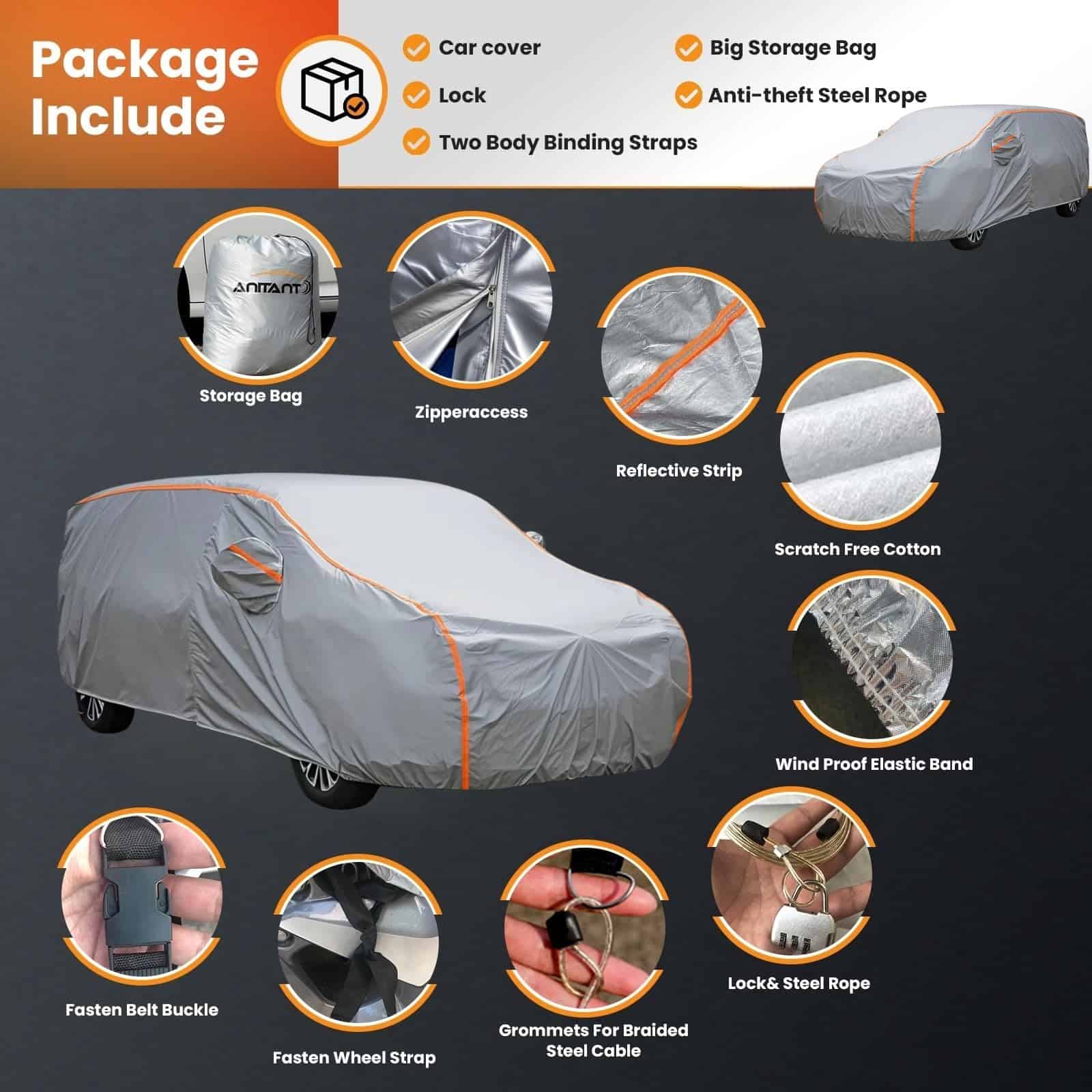 1. Nuevo material tecnológico: ANITANT es una nueva cubierta de coche de múltiples capas reales. Puede ser utilizada como cubierta para mini van, cubierta para coche grande, cubierta para coche impermeable para todo clima de tamaño completo, debido a que la nueva tecnología de múltiples capas puede resistir una presión de agua de 8000pa, el PE y PEVA de alta densidad también es muy duradero y duradero bajo la luz solar. La capa exterior de aluminio reflectante reflejará la mayor parte de la luz solar para mantener el coche fresco en el interior. El algodón grueso mantendrá su coche libre de arañazos y reducirá el impacto del granizo. 2. Diseño: Esto se podría considerar como una cubierta para coche impermeable para todo clima, cubierta para mini van, muestra típica de coche se refieren a la cubierta de coche Honda Odyssey. 1 Banda elástica a prueba de viento en la parte delantera y trasera. 2 La hebilla del cinturón pasa por debajo del coche para fijarla. 3 Un diseño de cremallera en el lado del conductor para una entrada fácil. 4 Cable de acero y cerradura para evitar pérdidas. 5 Tira reflectante cubre la línea de costura para recordar a otras personas y detener la lluvia que pasa por la costura. 6 4 tiras para la rueda para asegurar la cubierta rápidamente. 7 Incluye una bolsa de almacenamiento. 3. Dimensión del vehículo: Apto para todos los MPV cuya longitud es de 191″. Encuentre la longitud de su coche en la imagen de la izquierda y más tamaños de coches en la tabla detallada a continuación. Esto es una cubierta para coche MPV impermeable para todo clima, cubiertas para coche MPV impermeables para todo clima. Adecuado para funda Toyota Sienna, funda Chrysler Pacifica, funda Voyager, Buick GL8, Mercedes EQS, furgoneta Ford Transit Cargo, Windstar, Honda Odyssey, VW Arteon. 4. Protección en todas las condiciones: La cubierta ANITANT es capaz para todo clima. Para dar una mejor comprensión, están las cubiertas Dodge Grand Caravan, Volvo V90, Honda Odyssey. Este nuevo material súper impermeable de 8000pa protege de manera segura su coche de los rayos UV, la lluvia, la nieve, el polvo, el granizo y los excrementos de aves. 5. Garantía: Esta funda para mini van, fundas de coche. Por favor, verifique el tipo y la longitud del coche en la imagen de la izquierda o encuentre el tamaño de su coche en la tabla detallada a continuación. Ofrecemos una garantía de medio año. Si tiene alguna pregunta, no dude en contactarnos.