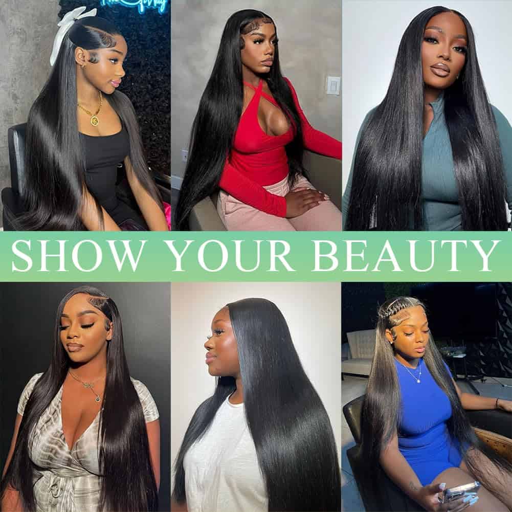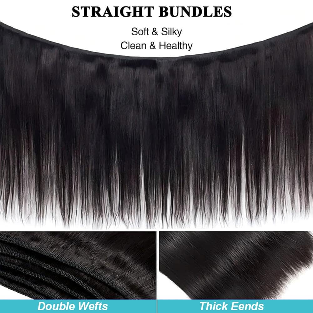 1. Paquetes de cabello humano liso: Cabello virgen liso 100% brasileño, más completo y grueso. Suave, sin enredos y no se cae. Se puede teñir, rizar, alisar y diseñar como desee.
