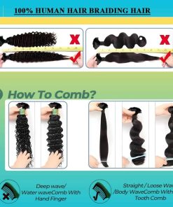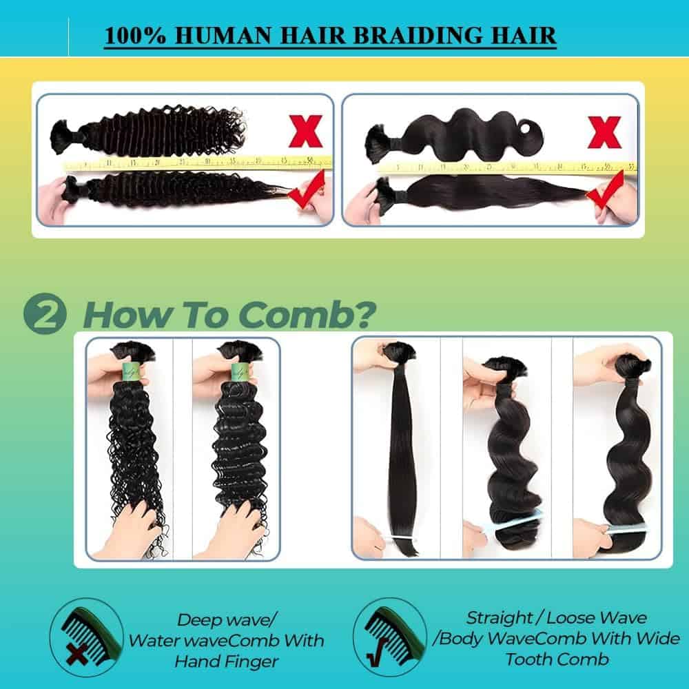 1. Material de cabello para trenzar: el cabello para trenzar es de cabello humano puro sin procesar 12A, libre de productos químicos, olor, está limpio y suave. Natural y saludable, suave y elástico, completo y denso.