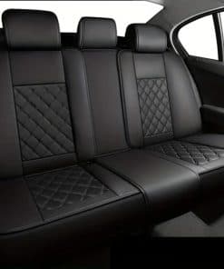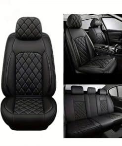 Universal fit para la mayoría de sedanes, SUV, camiones, furgonetas con 5 asientos, un juego completo que incluye 2 fundas para los asientos delanteros, 1 funda para el respaldo trasero (3 piezas separadas), 1 funda para el asiento trasero (3 piezas separadas). La funda del asiento trasero está diseñada con longitud ajustable para ajustarse a diferentes tamaños de asiento. Diseño elegante y material ecológico, fabricado con cuero Microfibra Poliuretano premium y rayón de alto rebote: suave, liso, duradero y transpirable. Mucho más duradero y cómodo que la mayoría de productos similares. Resistente al desgaste e impermeable, no destiñe el color. Diseñado para permitir el uso de calefacción de asientos, ventilación, cinturones de seguridad, bolsillos traseros para utensilios, soporte para vasos y división trasera 40/60 después de la instalación. Los asientos delanteros tienen bolsillos traseros para llaves, teléfonos y revistas. Ofrecemos docenas de fundas de alta calidad, visítanos para descubrir más. Haz un regalo pensado para tus queridos amigos y familiares. La satisfacción del cliente es nuestra máxima prioridad, garantía de devolución de dinero si no estás satisfecho.