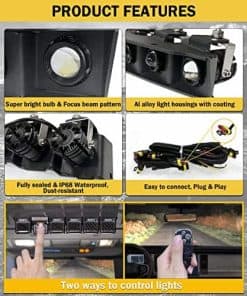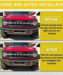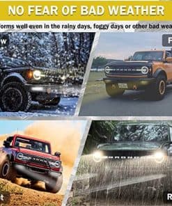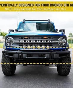 ¿Buscas una solución de luces de niebla perfecta para tu Ford Bronco? ANMOSVO ha diseñado kits de luces de niebla LED para la defensa modular de acero en el Ford Bronco 2021+ de 2/4 puertas. Estos kits de niebla se ajustan a la defensa HD modular tan perfectamente como desearías. Rápidamente obtén una iluminación LED de primera clase que ilumina dondequiera que te lleven tus aventuras. Interruptores bluetooth y auxiliares: Diseño de actualización – ¡Viene con Bluetooth! Si tu Bronco no tiene un banco de interruptores auxiliar de fábrica, nuestras LED de la defensa delantera serán la mejor opción para ti. Nuestras luces ofrecen 2 formas de controlar el color de la luz, interruptores auxiliares y Bluetooth. Sin AUX, fácil de obtener lo que deseas a través del controlador Bluetooth que no necesita más tiempo y recoger cableado extra. Iluminación para cada situación: Los pods de niebla ANMOSVO incluidos con este kit están disponibles tanto en opciones de pod LED blanco frío como ámbar selectivo. El blanco es una temperatura de color de 6000K, que es una salida blanca fría real, y coincide con la mayoría de la iluminación LED de fábrica, fácil de obtener una visibilidad extra en clima despejado y carreteras oscuras. El ámbar es una temperatura de color de 3000K, ideal para alto contraste en mal tiempo, polvo o un aspecto distintivo en la carretera. ¡Esta combinación proporciona una salida de luz ideal ya sea que estés en carretera o todoterreno! Instalación sencilla mediante tornillo: Sin perforaciones o modificaciones, 100% plug and play. La instalación sencilla mediante tornillo utiliza las ubicaciones de los tornillos de fábrica. El tiempo de instalación típico es de menos de 30 minutos y se puede instalar con éxito utilizando herramientas manuales comunes incluso por los entusiastas más casuales. El tiempo de instalación típico es de menos de 30 minutos y se puede instalar con éxito utilizando herramientas manuales comunes incluso por los entusiastas más casuales. Luces de defensa LED con soportes y características de hardware: 8 x 20w CREE LED para 6000K Blanco / 3000K Lumen Bruto Salida de luz Los alojamientos de luces de niebla de acero recubiertas en polvo para durabilidad duradera y protección contra la corrosión Diseño de salida de haz de luz de niebla de precisión Conectores moldeados impermeables IP68 vida útil de hasta 100.000 horas