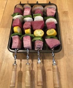 Amplía los alimentos cocinados en tu barbacoa o parrilla de gas con pinchos de acero inoxidable perfectos para hacer inolvidables shish kabobs! Los pinchos de barbacoa metálicos profesionales para estilos de comida estadounidense, rusa, armenia, del Medio Oriente e incluso asiática, se pueden utilizar con carne de res, pescado, cerdo, zanahorias, cebollas, khabob, champiñones y más. Y debido a que cuentan con un extremo en espiral, la comida no se deslizará cuando los recojas, lo que los hace perfectos para elegir comidas más saludables y deliciosas. Juego de 12 Pinchos Mejor Acero Inoxidable Seguro de Grado Alimenticio Pinchos de parrilla largos y anchos brasileños, persas, armenios y turcos Extremo en forma de V, Mango Antideslizante Reutilizable y Respetuoso con el Medio Ambiente Resistente al óxido Apto para lavavajillas Peso: 1.8 lb. Longitud: 22 pulgadas Ancho: 0.4 pulgadas Grosor: 0.08 pulgadas Consejos Cordiales: 1. Los niños deben ser utilizados bajo la supervisión de adultos, ya que los pinchos de acero inoxidable son afilados. 2. Se recomienda almacenar los palos de barbacoa en un lugar fresco, seco y ventilado.
