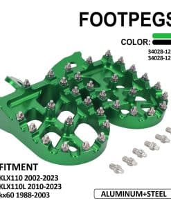 Características: Fácil de instalar. 100% nuevo, nunca instalado, de alta calidad. Todo el conjunto adopta material de aleación de aluminio para el proceso de mecanizado CNC. Se instalan tacos antideslizantes en la superficie de contacto del pedal, que tiene un buen efecto antideslizante. Para reducir su peso, la superficie del pedal está anodizada para un color más estéticamente agradable. Recibirá el mismo artículo exacto que se muestra en la imagen. Ajuste: Para KLX110 2002-2023 Para KLX110L 2010-2023 Para KX60 1998-2003 Especificación: Color: Como en las imágenes Material: Aleación de Aluminio 6061 + Acero Inoxidable Incluye: 1 Par de Reposapiés con resorte + pasador de acero inoxidable + pasador de horquilla Como en las imágenes La instrucción de instalación NO está incluida.