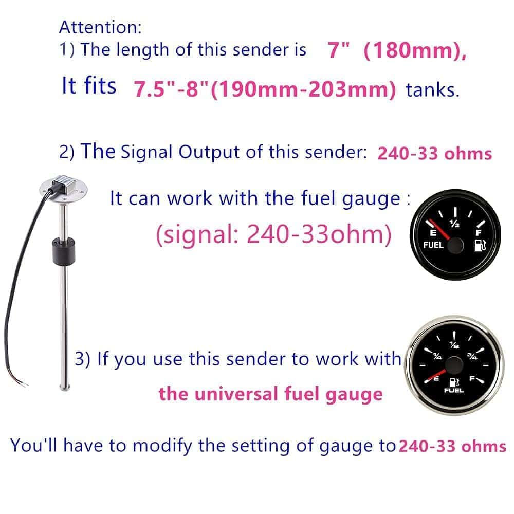 La unidad de envío de combustible/agua AODITECK es el reemplazo directo para la unidad de envío de brazo oscilante para una mayor durabilidad y confiabilidad. Características y beneficios de la unidad de envío AODITECK incluyen: cuerpo de acero inoxidable SUS 316, diagrama de cableado fácil de seguir, barrido estándar de 90 grados y actualización a 270 grados, salida estándar americana (240 ohms al vacío, 33 ohms lleno). Material: cuerpo de acero inoxidable SUS 316, cable de PVC, flotador de NBR, métodos de montaje: patrón estándar SAE de 5 orificios, clasificación de protección IP67, señal de salida: estándar americano 240-33 ohms, rango de resolución, temperatura operativa: -40 F ~ +85 F (-40 C ~ +85 C). El paquete incluye: 1 x Unidad de envío de combustible AODITECK, 1 x junta, 5 x tornillos M5 0.8 Longitud (16mm), 1 x Guía de instalación de la unidad de envío. Nota: preste atención a la descripción del producto, especialmente la resolución y longitud antes de realizar el pedido.