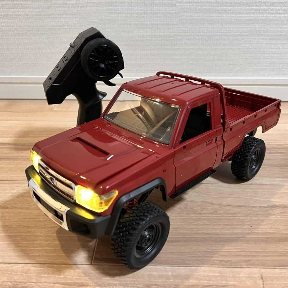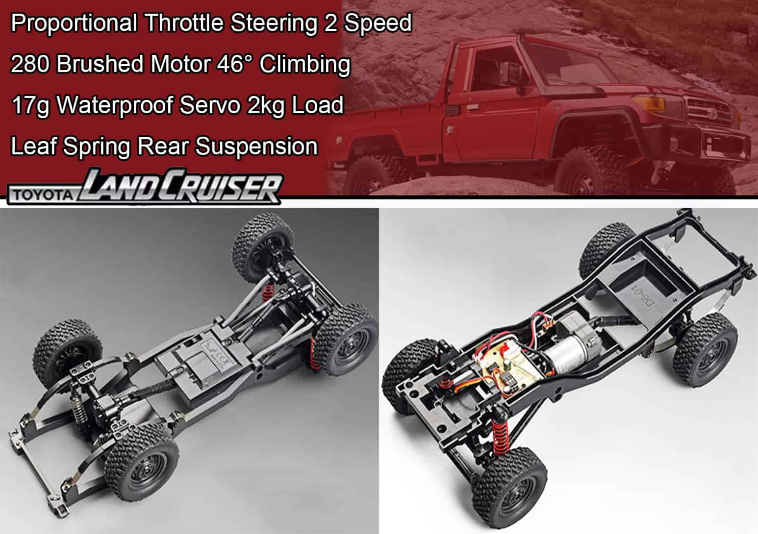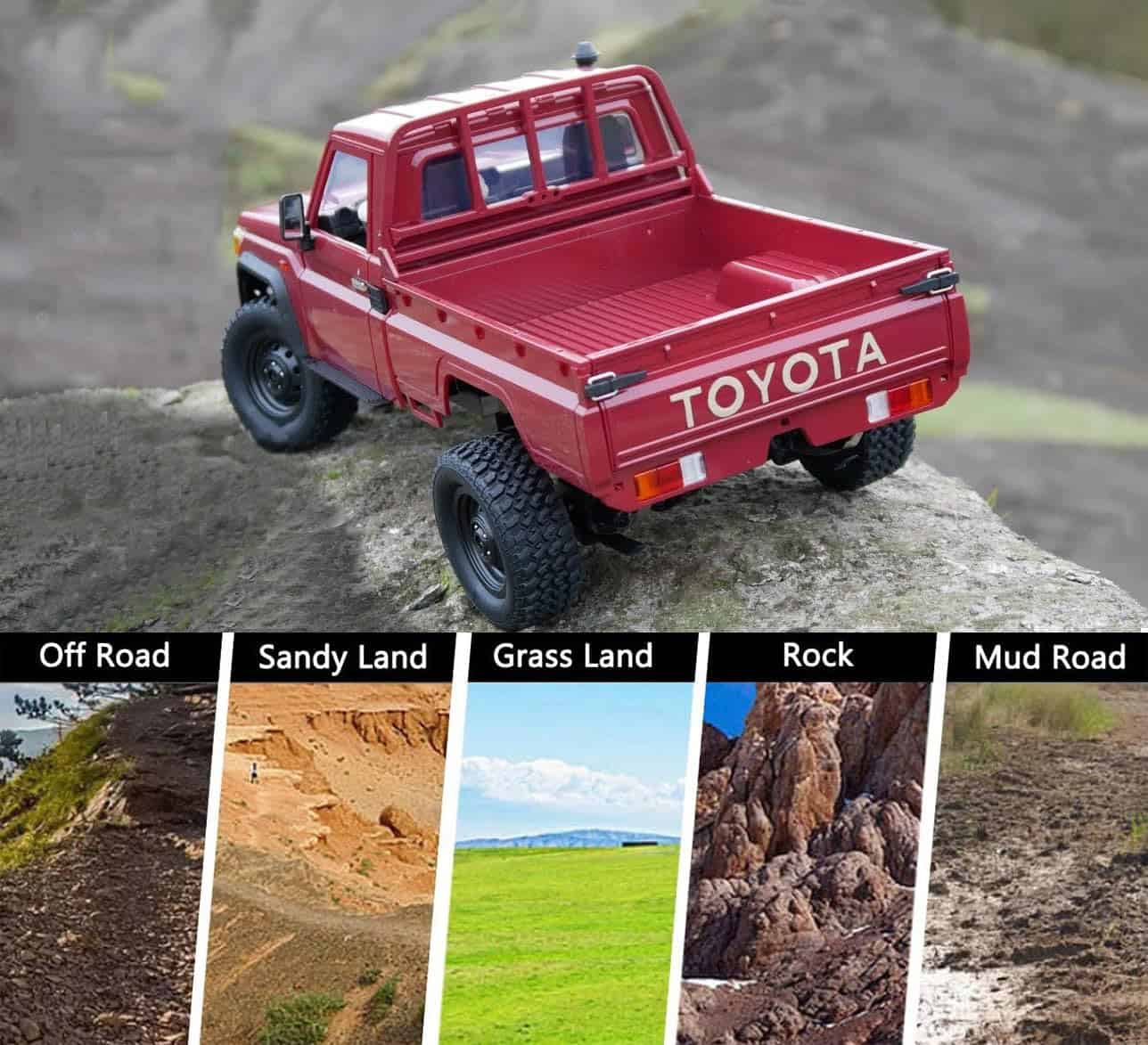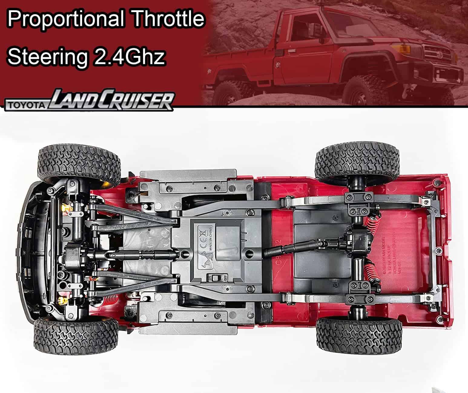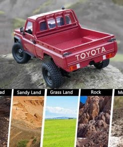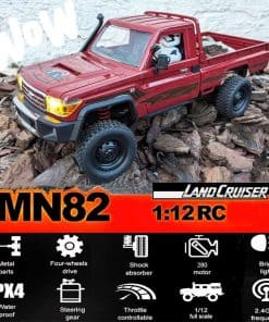 Coche RC todoterreno con escala 1/12 del Toyota Land Cruiser 79, 2.4G RC Crawler Truck – un vehículo todoterreno altamente realista y detallado que promete una experiencia de conducción a control remoto inolvidable. Con un motor cepillado de 280, carga de 2kg, servo impermeable de 17g, sistema de tracción 4WD, 2 velocidades de aceleración, modelo a escala 1:12 con capó y portón trasero abribles, este coche es perfecto tanto para principiantes como para entusiastas experimentados de RC. Chasis de metal resistente con un sistema de dirección mejorado que permite al control remoto el máximo de escalabilidad a 46 grados, gran ángulo de torsión, un alto par y actuaciones flexibles. Con suspensión de muelles, el sistema de chasis protege al camión RC todoterreno de la vibración causada por superficies de carretera irregulares, lo que resultará en una conducción más estable. Lleva luces LED brillantes que conducen sin obstáculos incluso por la noche. Sin preocupaciones sobre este RC rock crawler 4×4 funcionando en barro, pradera, arena y terrenos con baches. El crawler es adaptable a cualquier situación o estilo de conducción. Experimenta una auténtica conducción todoterreno. Juega y conduce al aire libre y diviértete mucho allí. Este camión control remoto MN 82 está diseñado con una función de camioneta pickup realista. Esta RC Truck de 1/12 es una opción decente en vacaciones para adultos mayores de 16 años. Si tienes alguna pregunta, por favor házmela saber y me aseguraré de corregir las cosas.