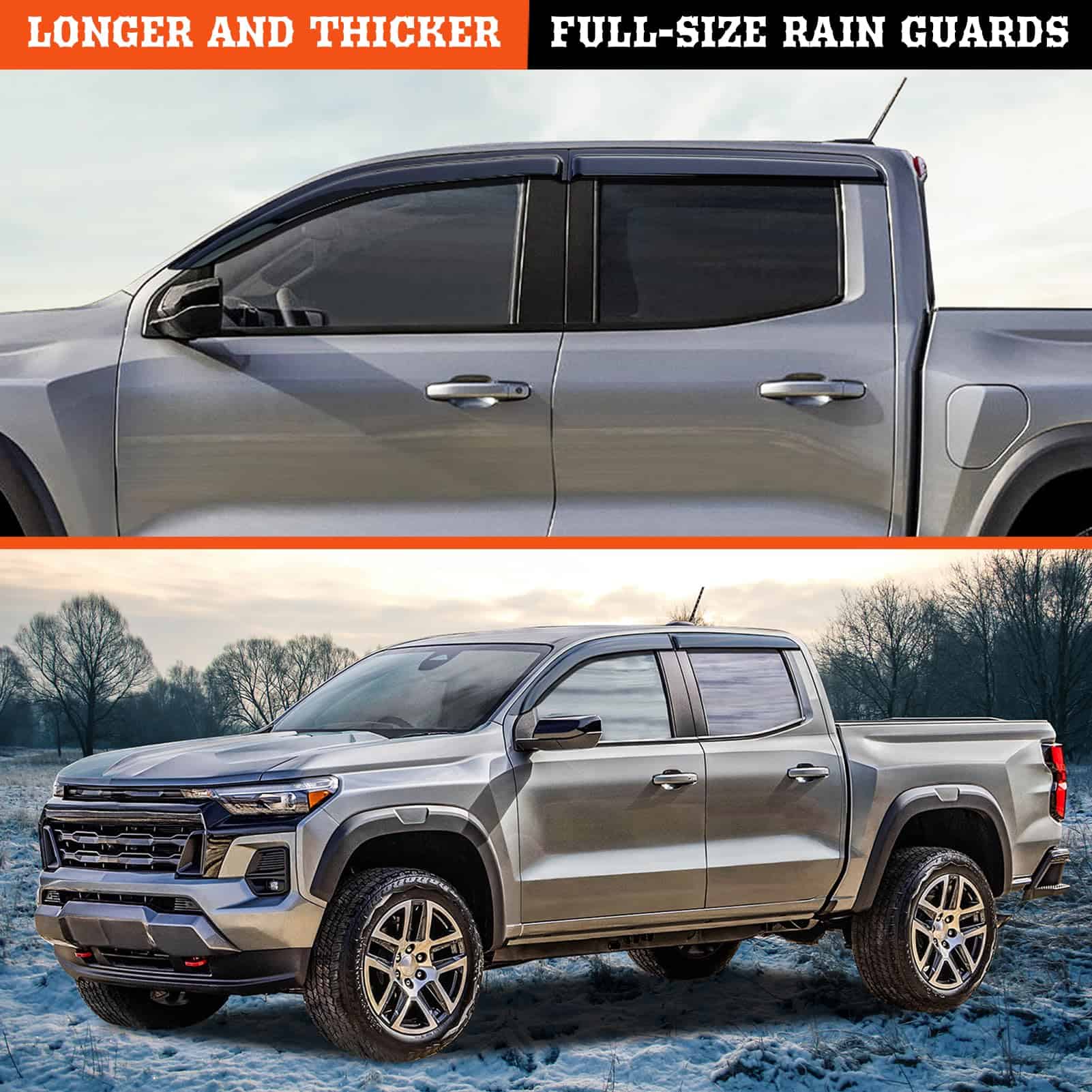 1. ¡Atención! Verifique el modelo y el año de su automóvil antes de comprar. Los protectores de lluvia más gruesos de APILT están diseñados solo para 2023-2025 Chevrolet Colorado Crew Cab y para 2023-2025 GMC Canyon Crew Cab.