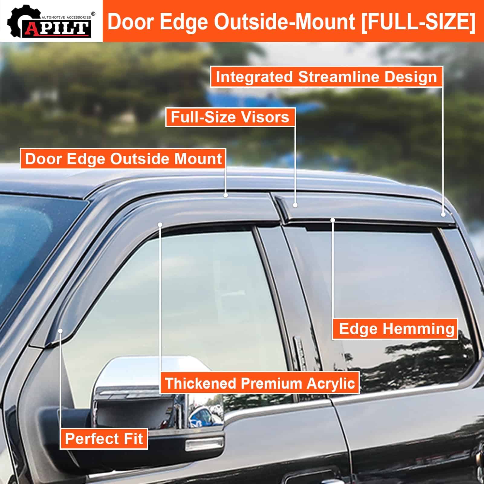 3. VISERAS DE VENTANAS DE TAMAÑO COMPLETO: Las viseras de ventanas más gruesas de APILT adoptan la tecnología original de apertura de moldes de escaneo de autos, que se ajusta perfectamente al cuerpo. En comparación con instalar las viseras en el borde de la ventana, la instalación de las viseras de ventanas en el borde de la puerta de APILT se asemeja más a los accesorios originales del auto, lo que puede mejorar la apariencia del modelo. Instalación rápida sin necesidad de perforar.