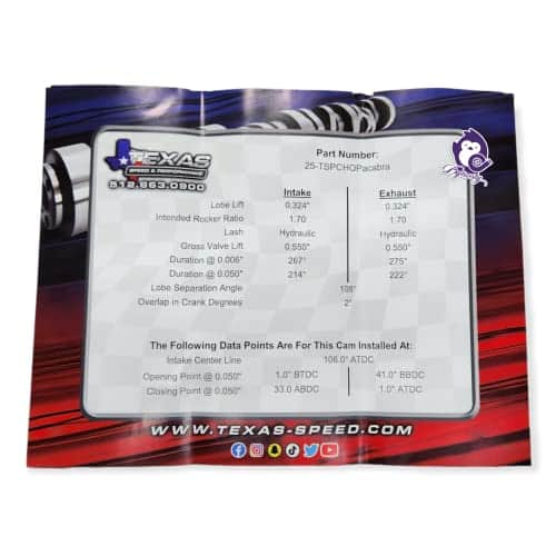 TSP «CHOPacabra» Truck Cam Specs: 214/222 .550/.550 108 LSA 106 ICL El árbol de levas CHOPacabra! ¡Este es un pequeño y salvaje árbol de levas. Diseñado para trabajar con resortes de válvula LS6 y un convertidor de par de fábrica. Si estás buscando ese sonido malvado y rendimiento que dejará a tu oponente dudando de lo que acaba de ver, ¡esto es! Motores más adecuados para: 4.8, 5.3, 5.7, 6.0 (Equipado con cabezas de puerto catedral) Deseado índice de compresión para el árbol de levas: 9,5:1+ Resortes recomendados Requeridos: Resortes de válvula GM LS6 Beehive. Convertidor de par de mercado de accesorios requerido: No. ¡Amistoso con convertidor de fábrica! Engranaje trasero actualizado requerido: No Rango de RPM de operación: 1200-6500 Aumento de potencia: Bajo pruebas en banco de potencia, ganó 67hp y 26ft lbs de torque en el cárter Manejabilidad: ¡Excelente manejabilidad con un chop increíble!