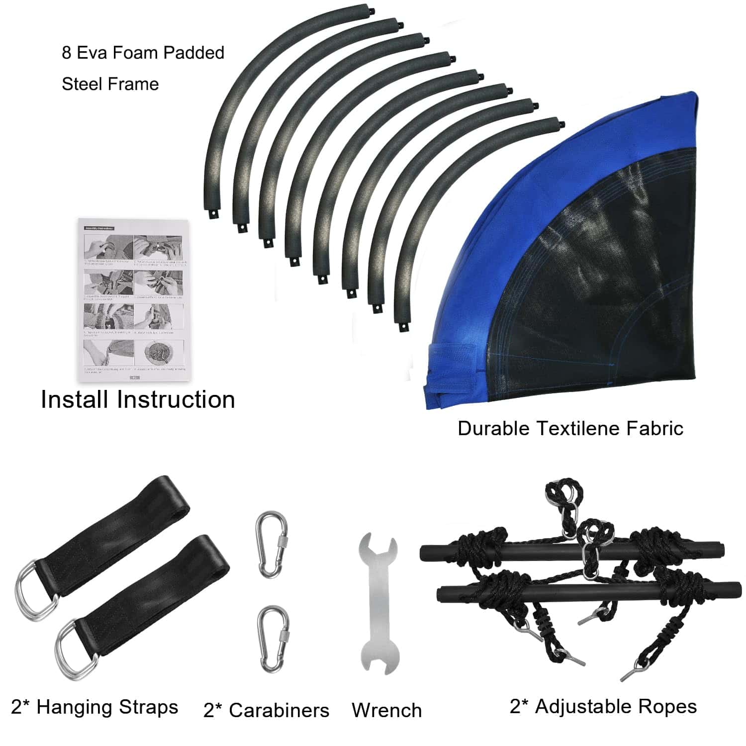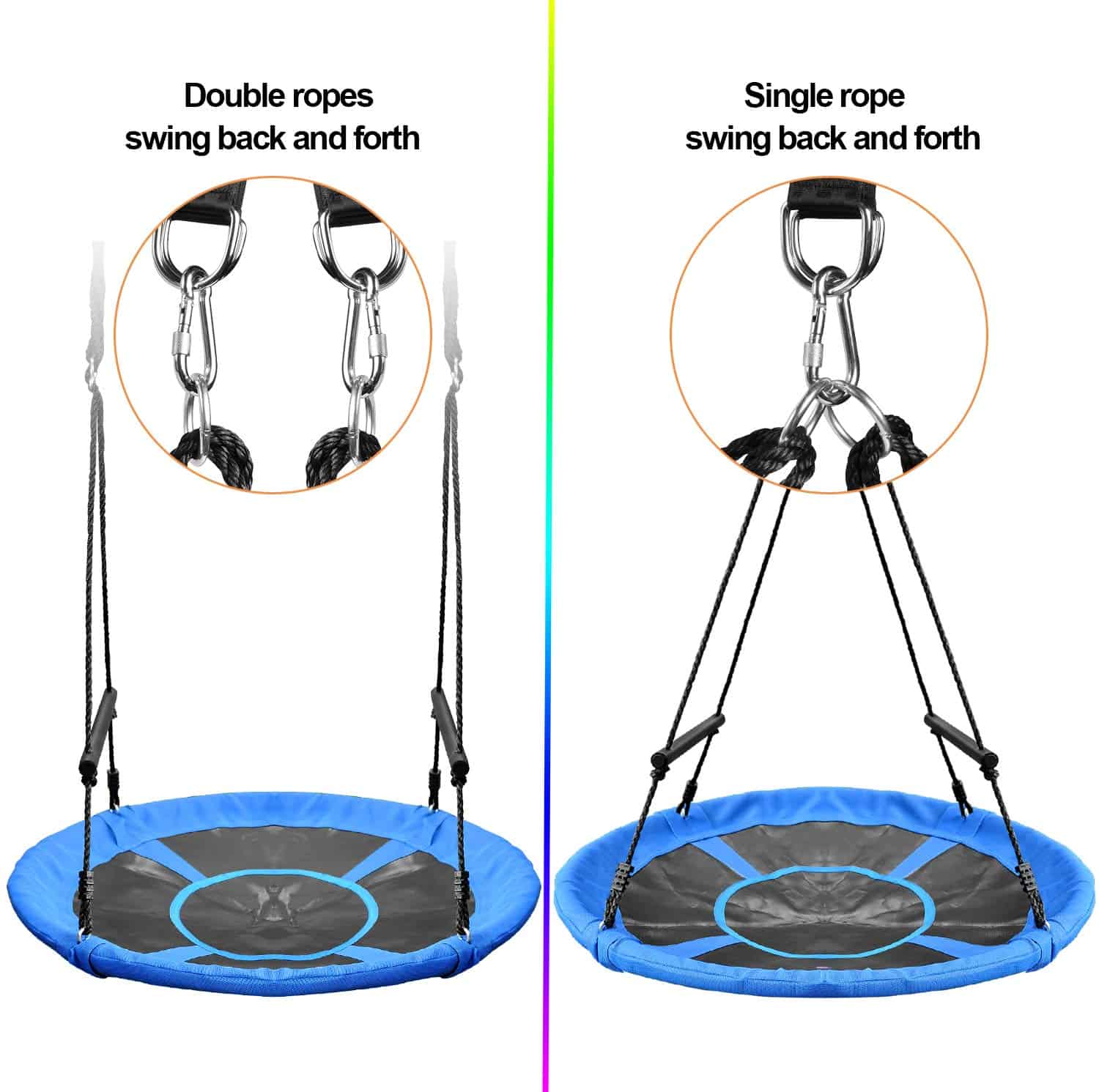 2. EQUIPO COMPLETO El columpio de disco incluye 2 correa de 10 pies para árboles y 2 mosquetones de acero inoxidable M9. No es necesario comprar correas o mosquetones adicionales. Este columpio de disco para árbol proporciona una resistencia superior y soporta hasta 700 lb y se adapta para que jueguen 2-3 niños juntos.